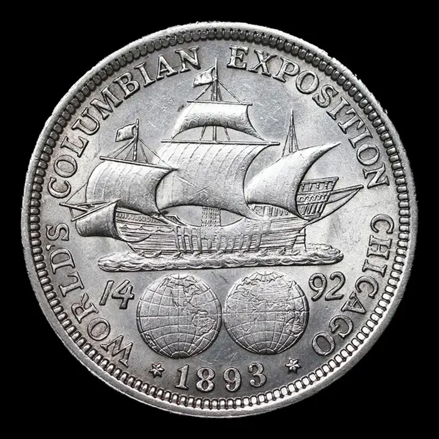 1893 Columbian Old Commem Half Dollar 50c Grades Choice Unc. The Columbus Half Dollar along with the Isabella Quarter were Minted in Honor of the 400th Anniversary of Columbus' Voyage to the New World. It was First Distributed at the Worlds Fair Honoring that Voyage. When examining a Columbian Exposition Half Dollar, the First Points to Show Wear are Columbus’ Eyebrow, Cheek and the Hair Behind his Forehead and Jaw. On the Reverse, Check the Foresail and Sainsail, as well as the Right Side of the Eastern Hemisphere.