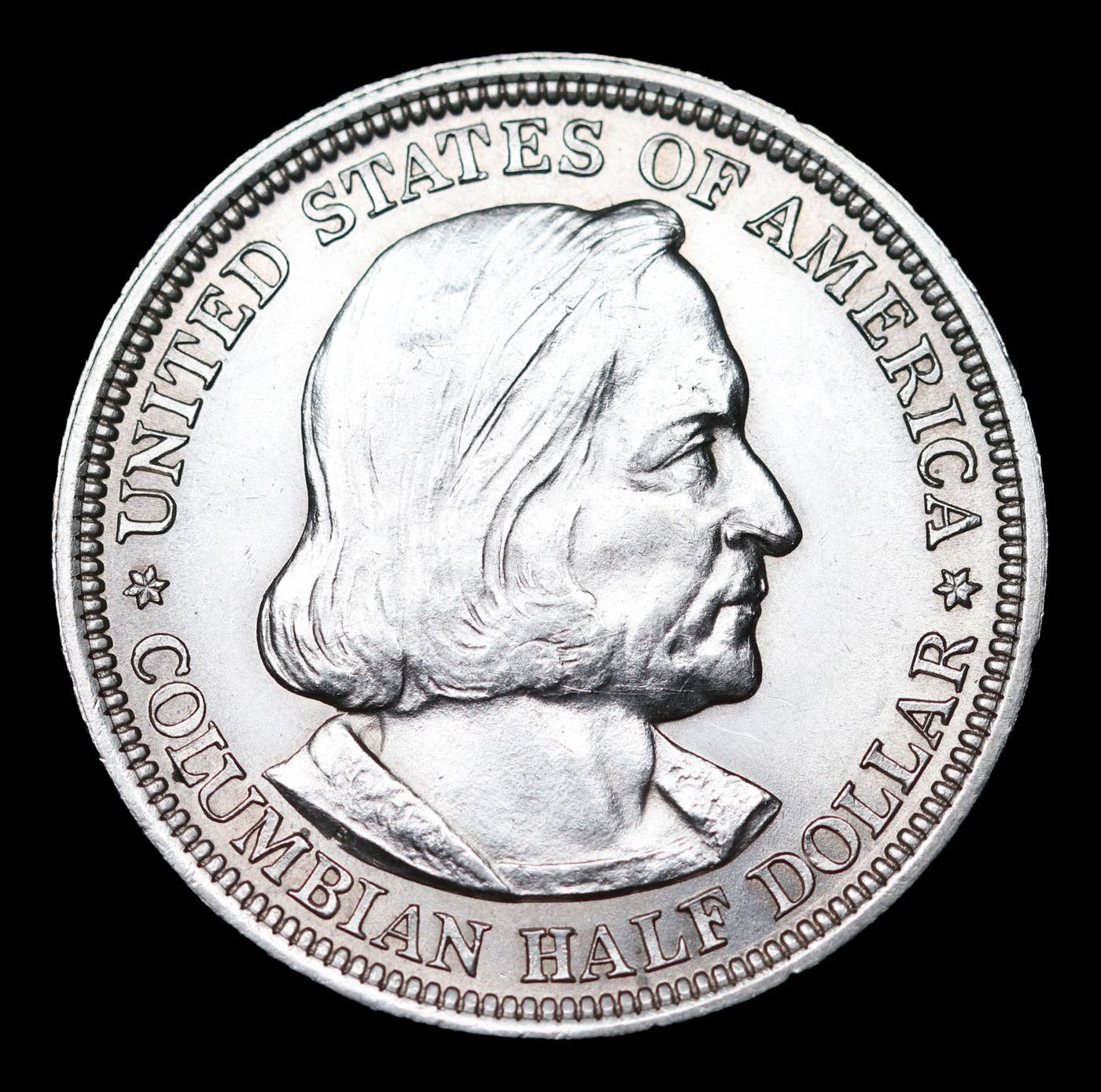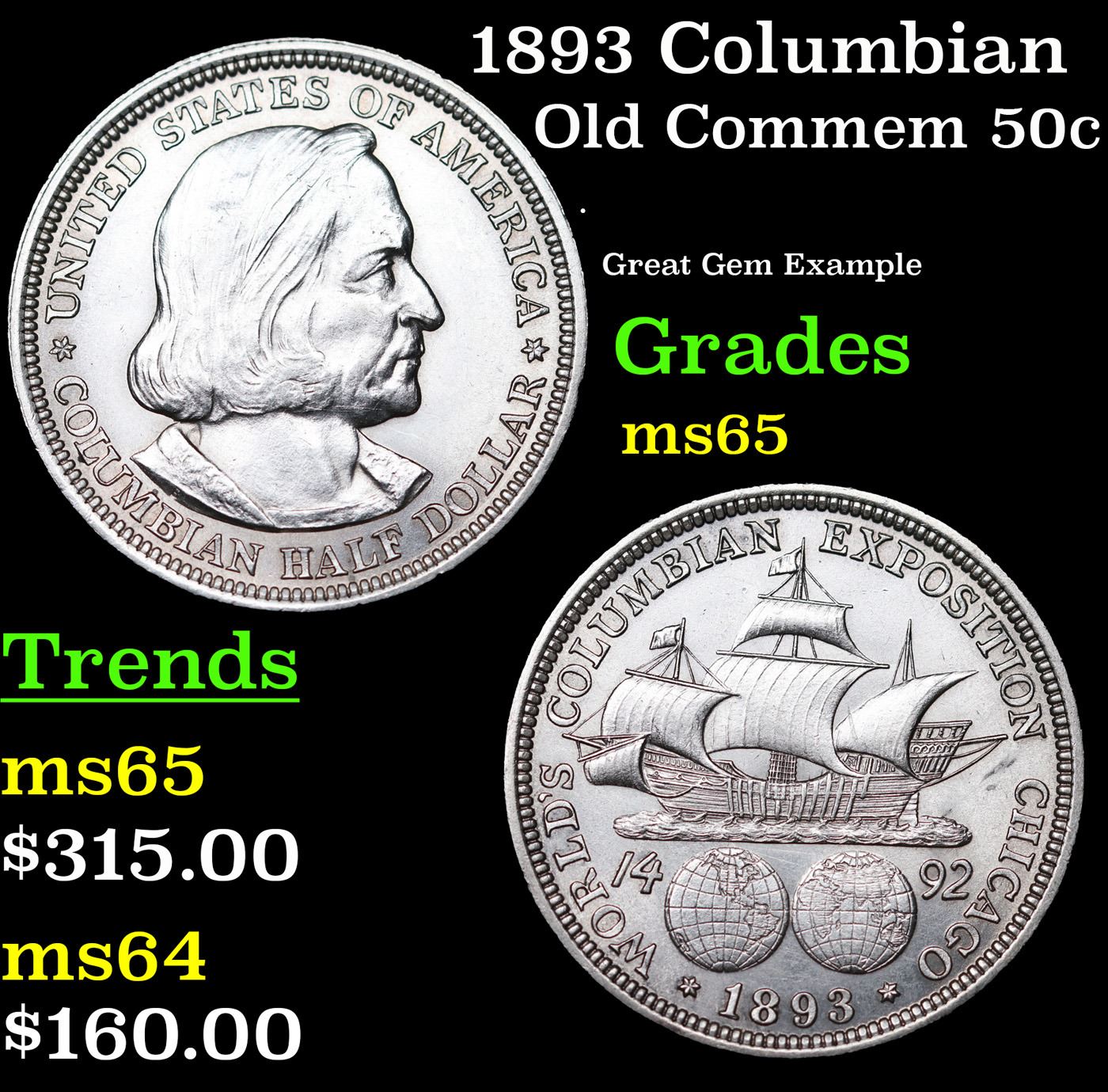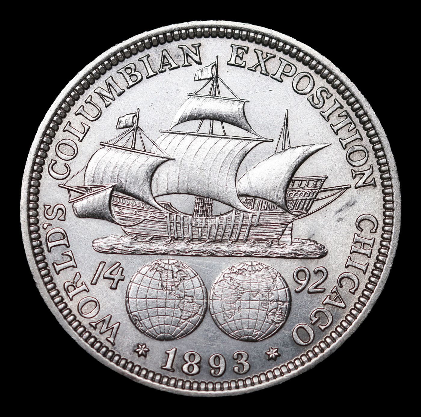1893 Columbian Old Commem Half Dollar 50c Grades GEM Unc. The Columbus Half Dollar along with the Isabella Quarter were Minted in Honor of the 400th Anniversary of Columbus' Voyage to the New World. It was First Distributed at the Worlds Fair Honoring that Voyage. When examining a Columbian Exposition Half Dollar, the First Points to Show Wear are Columbus’ Eyebrow, Cheek and the Hair Behind his Forehead and Jaw. On the Reverse, Check the Foresail and Sainsail, as well as the Right Side of the Eastern Hemisphere.
