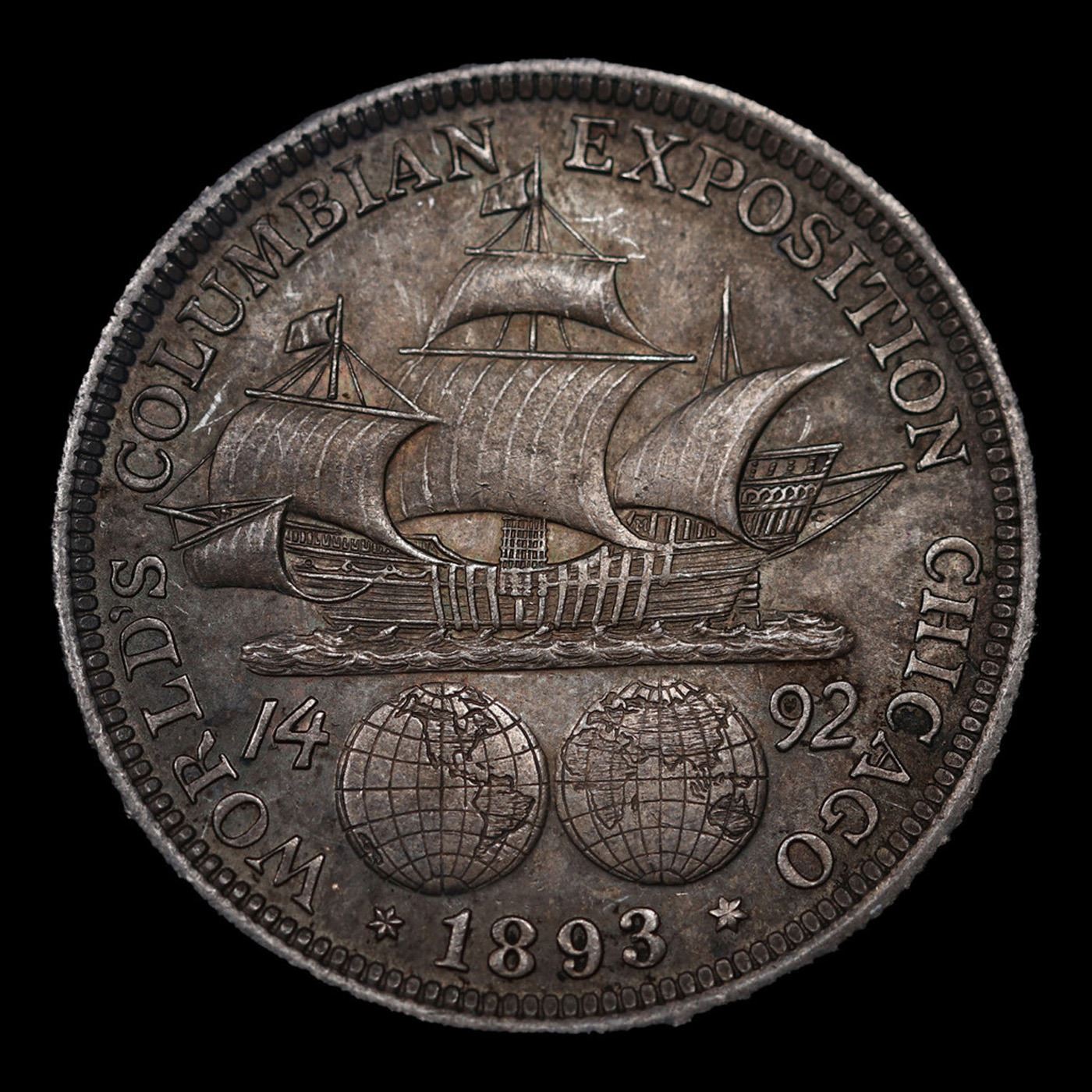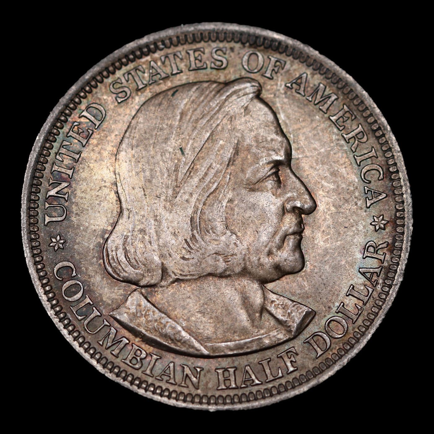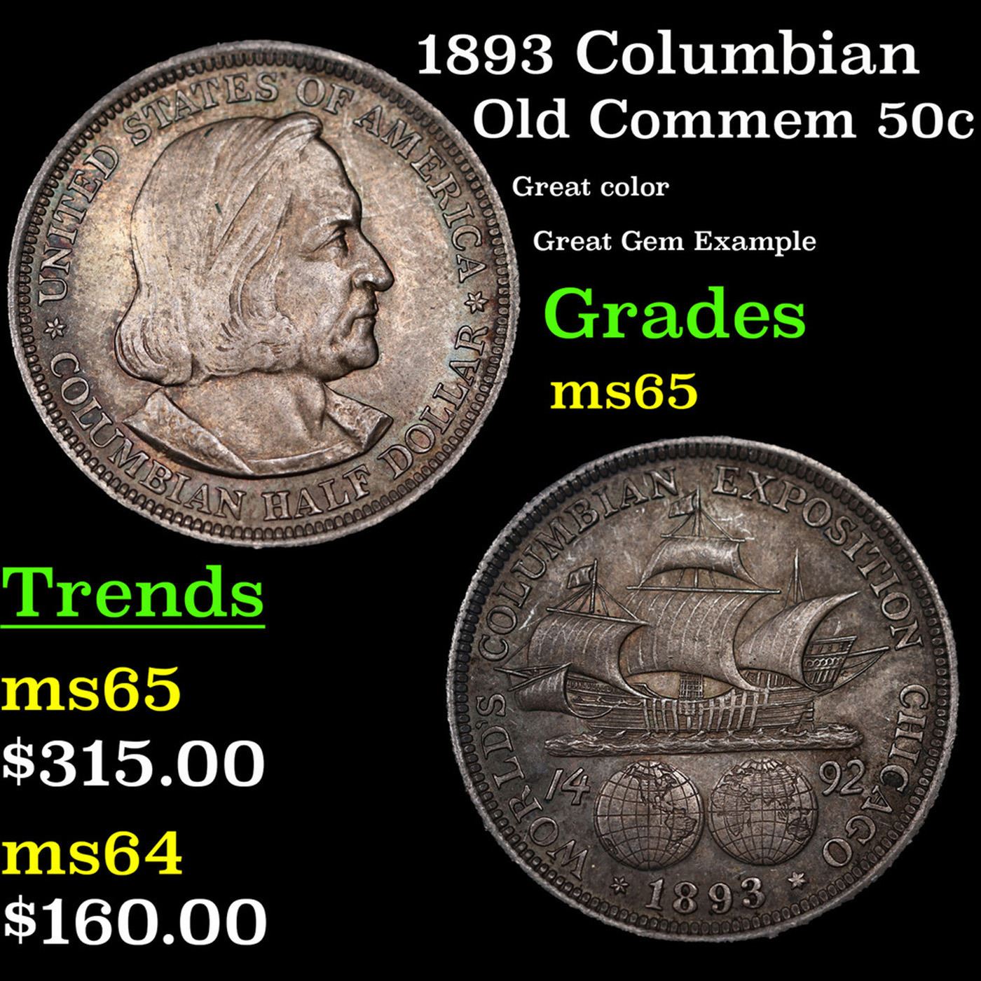 1893 Columbian Old Commem Half Dollar 50c Grades GEM Unc. The Columbus Half Dollar along with the Isabella Quarter were Minted in Honor of the 400th Anniversary of Columbus' Voyage to the New World. It was First Distributed at the Worlds Fair Honoring that Voyage. When examining a Columbian Exposition Half Dollar, the First Points to Show Wear are Columbus’ Eyebrow, Cheek and the Hair Behind his Forehead and Jaw. On the Reverse, Check the Foresail and Sainsail, as well as the Right Side of the Eastern Hemisphere.