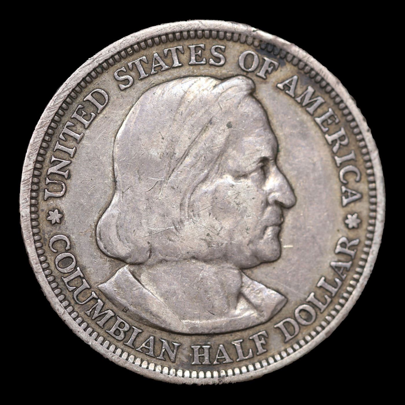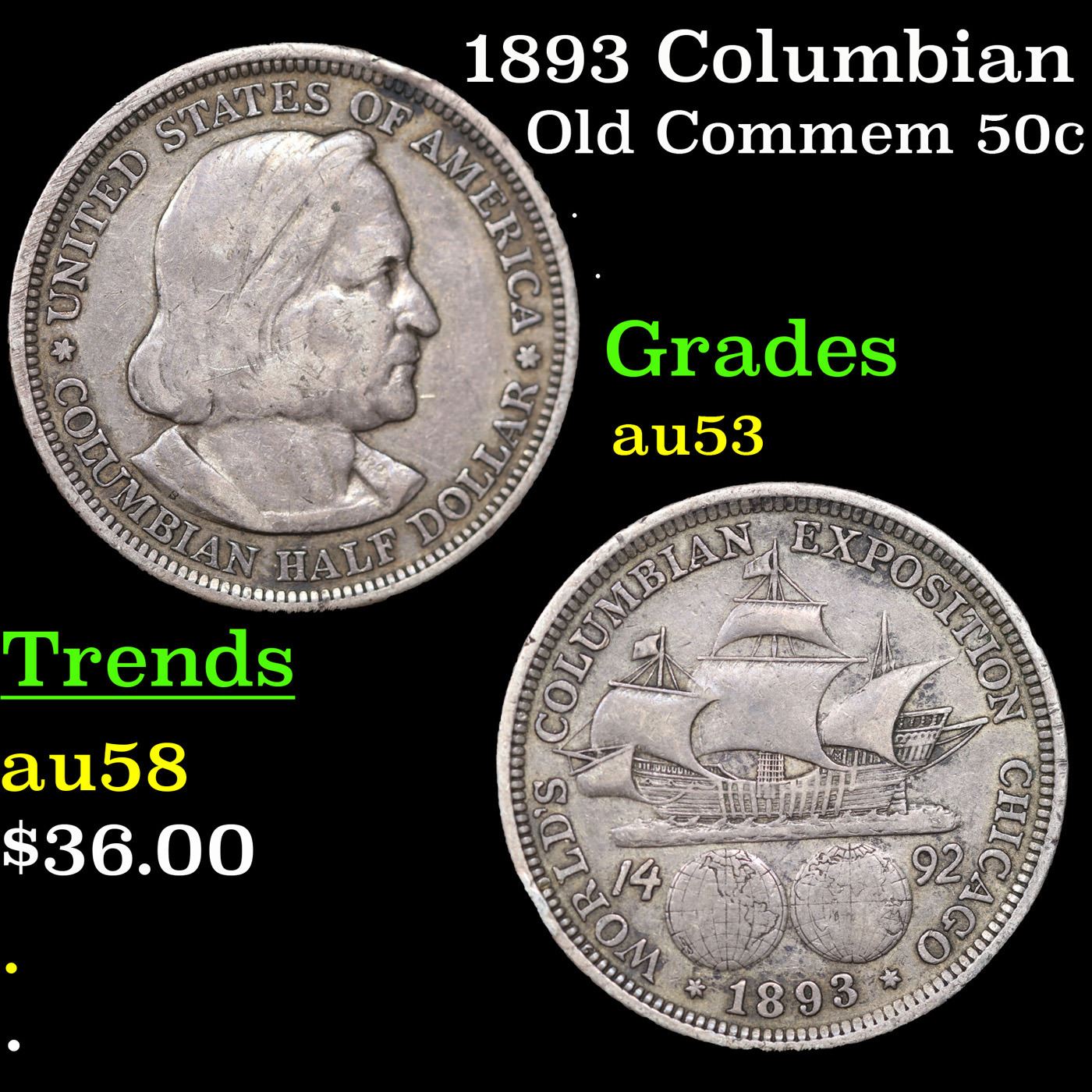 1893 Columbian Old Commem Half Dollar 50c Grades Select AU. The Columbus Half Dollar along with the Isabella Quarter were Minted in Honor of the 400th Anniversary of Columbus' Voyage to the New World. It was First Distributed at the Worlds Fair Honoring that Voyage. When examining a Columbian Exposition Half Dollar, the First Points to Show Wear are Columbus’ Eyebrow, Cheek and the Hair Behind his Forehead and Jaw. On the Reverse, Check the Foresail and Sainsail, as well as the Right Side of the Eastern Hemisphere.
