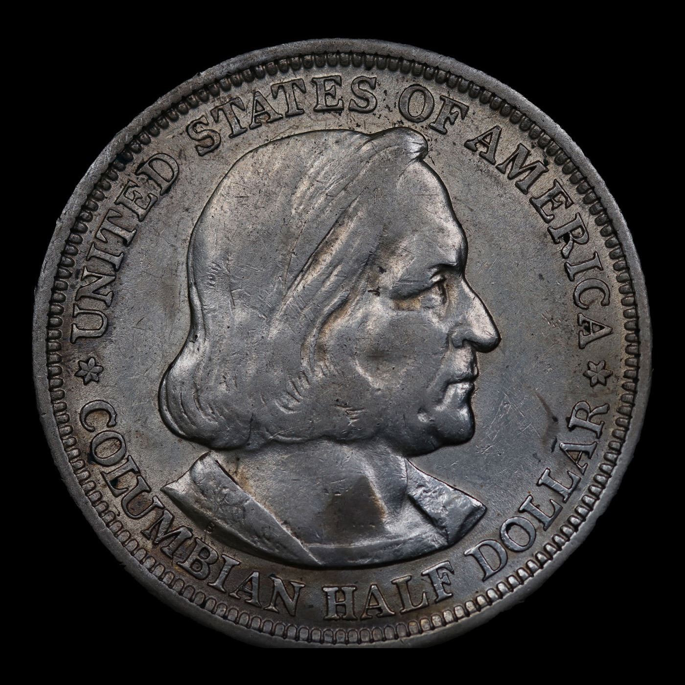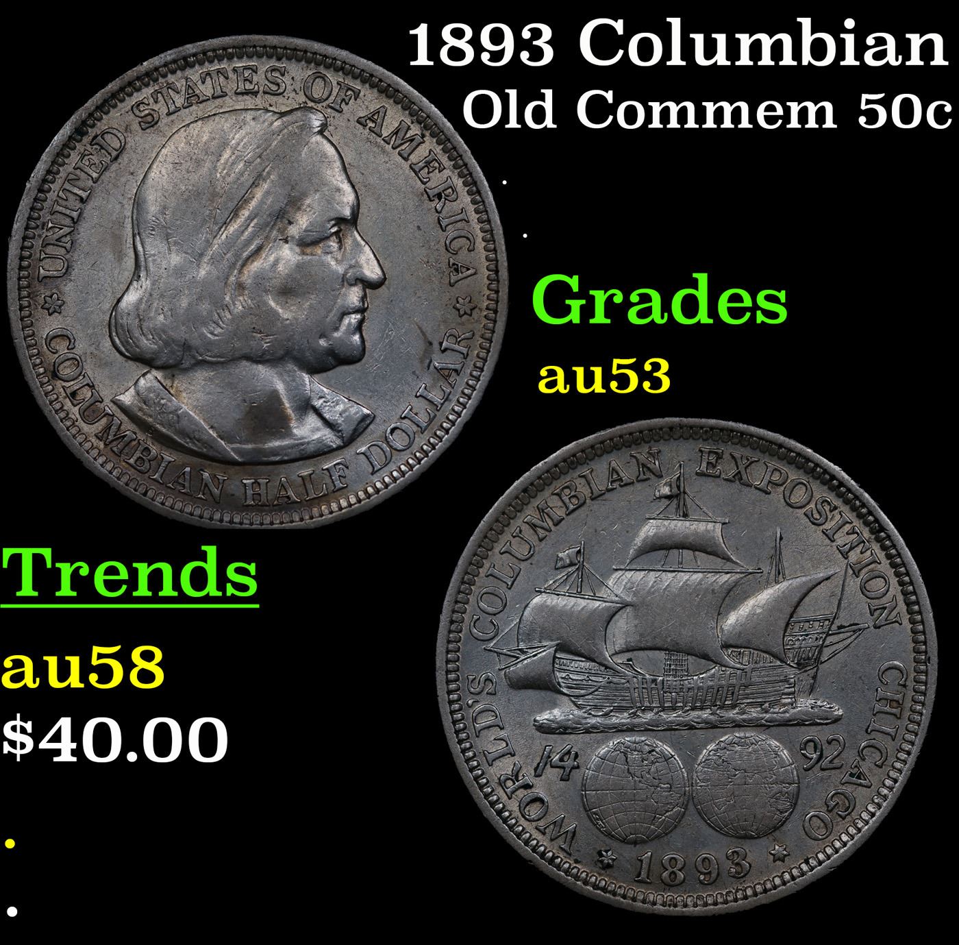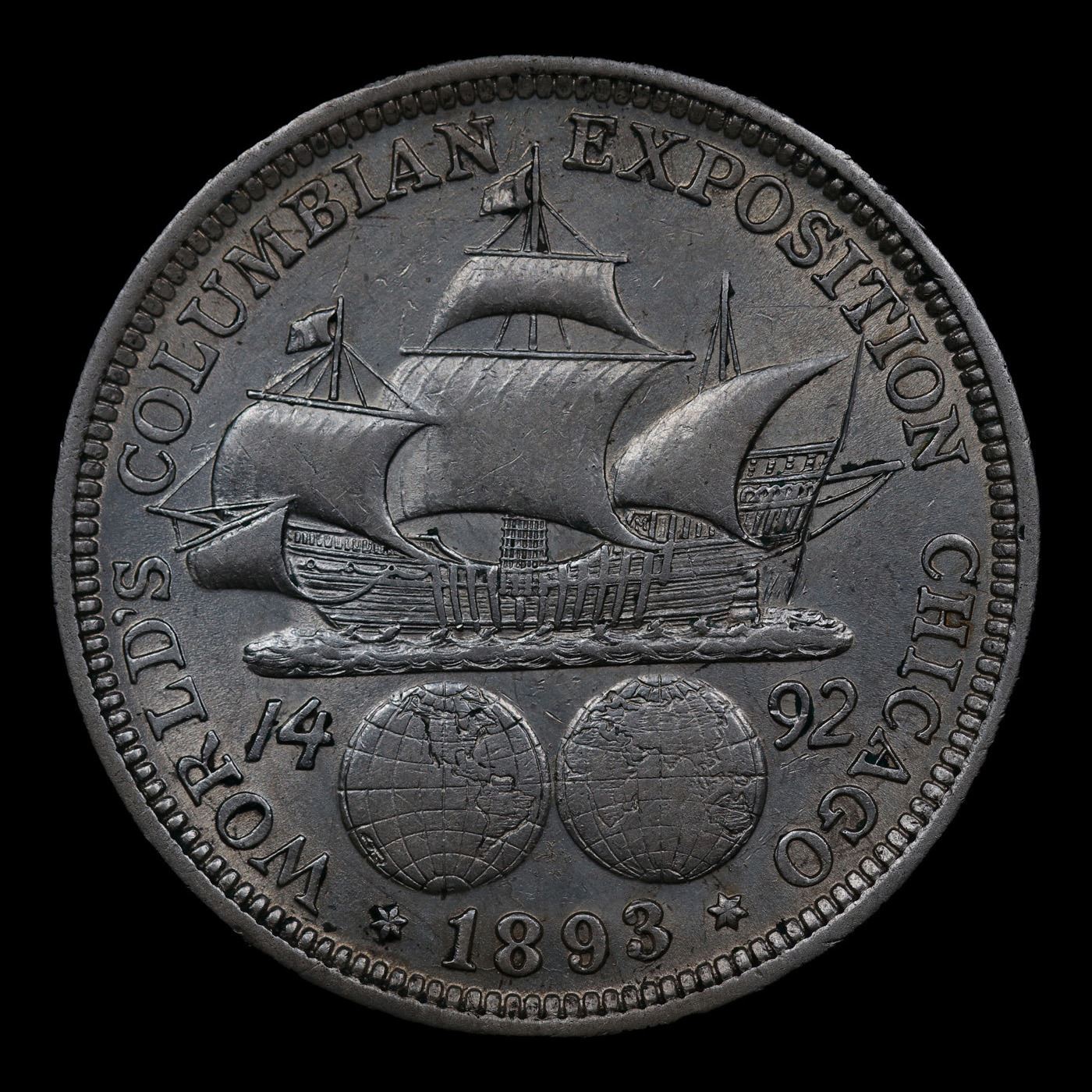 1893 Columbian Old Commem Half Dollar 50c Grades Select AU. The Columbus Half Dollar along with the Isabella Quarter were Minted in Honor of the 400th Anniversary of Columbus' Voyage to the New World. It was First Distributed at the Worlds Fair Honoring that Voyage. When examining a Columbian Exposition Half Dollar, the First Points to Show Wear are Columbus’ Eyebrow, Cheek and the Hair Behind his Forehead and Jaw. On the Reverse, Check the Foresail and Sainsail, as well as the Right Side of the Eastern Hemisphere.