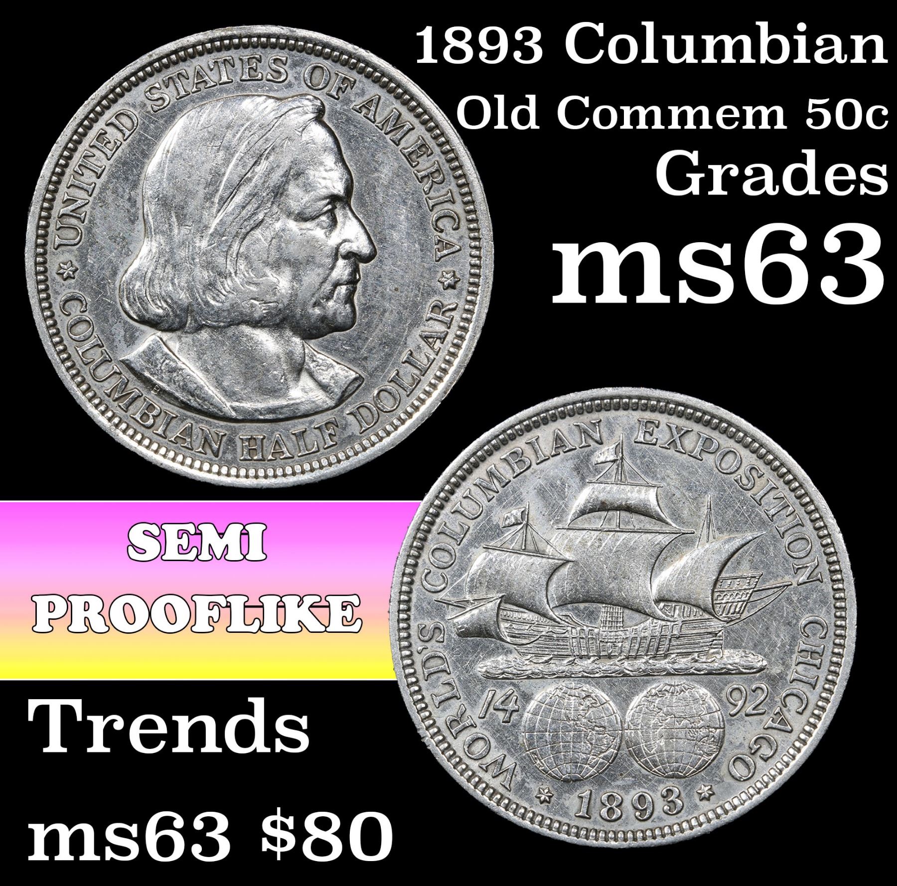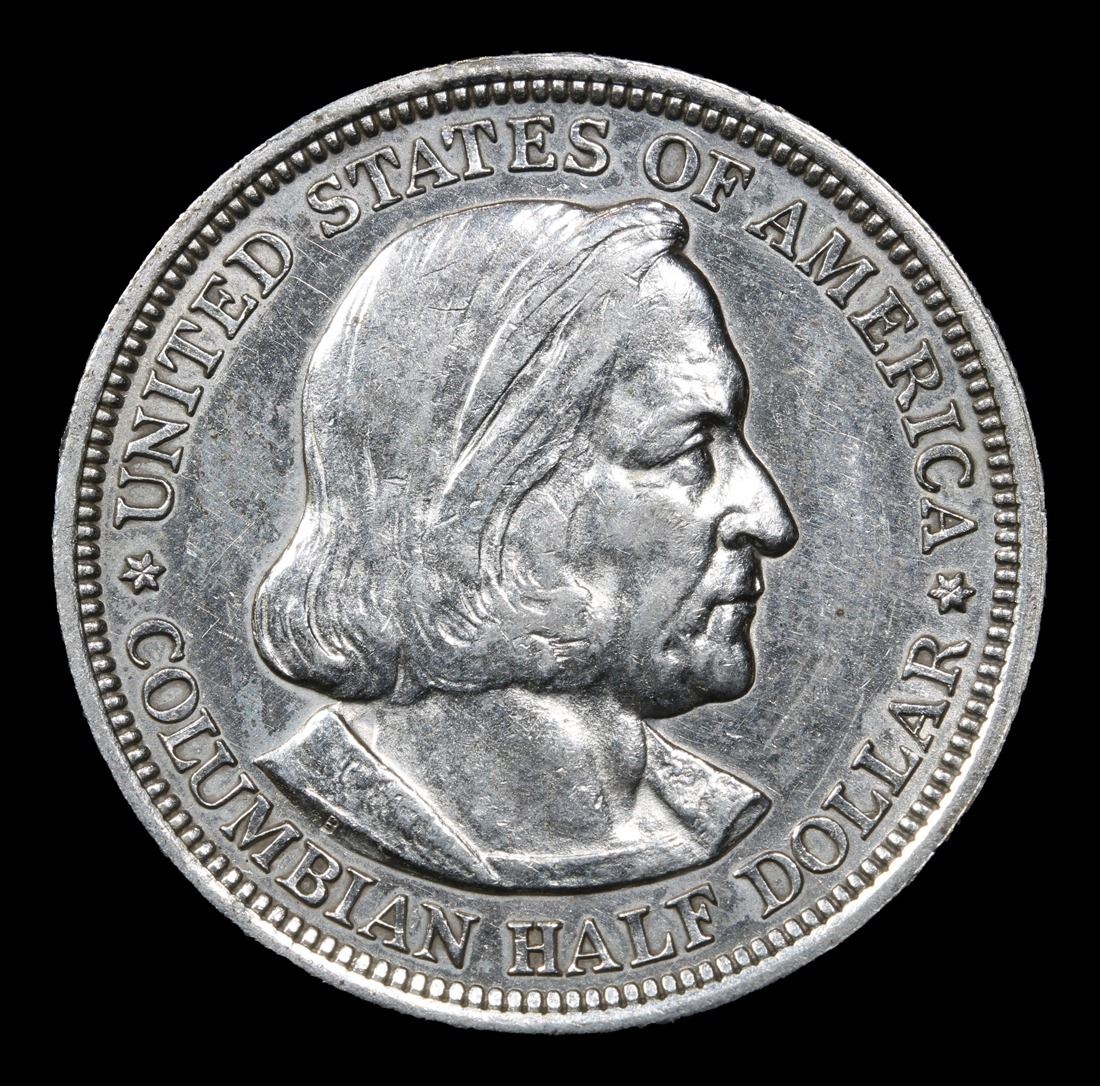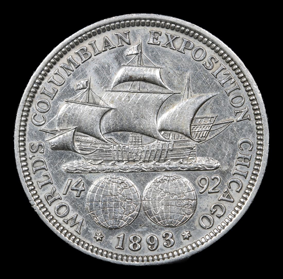 1893 Columbian Old Commem Half Dollar 50c Grades Select Unc. The Columbus Half Dollar along with the Isabella Quarter were Minted in Honor of the 400th Anniversary of Columbus' Voyage to the New World. It was First Distributed at the Worlds Fair Honoring that Voyage. When examining a Columbian Exposition Half Dollar, the First Points to Show Wear are ColumbusÕ Eyebrow, Cheek and the Hair Behind his Forehead and Jaw. On the Reverse, Check the Foresail and Sainsail, as well as the Right Side of the Eastern Hemisphere.