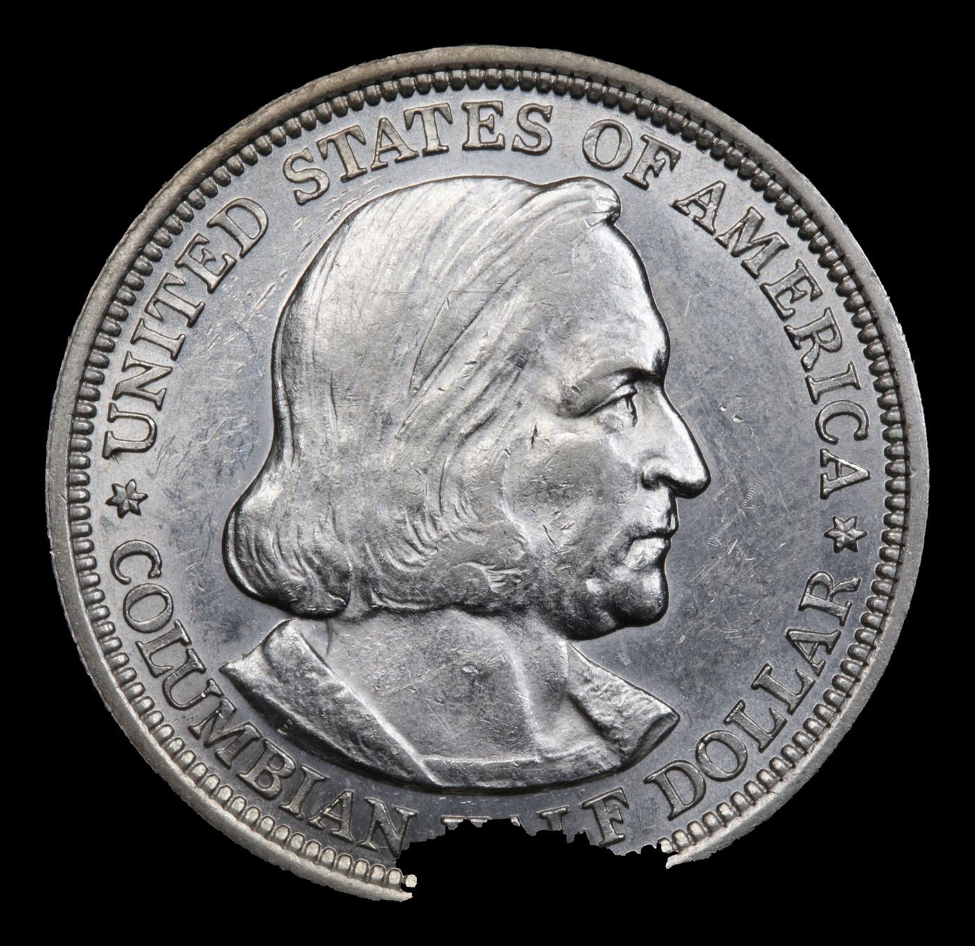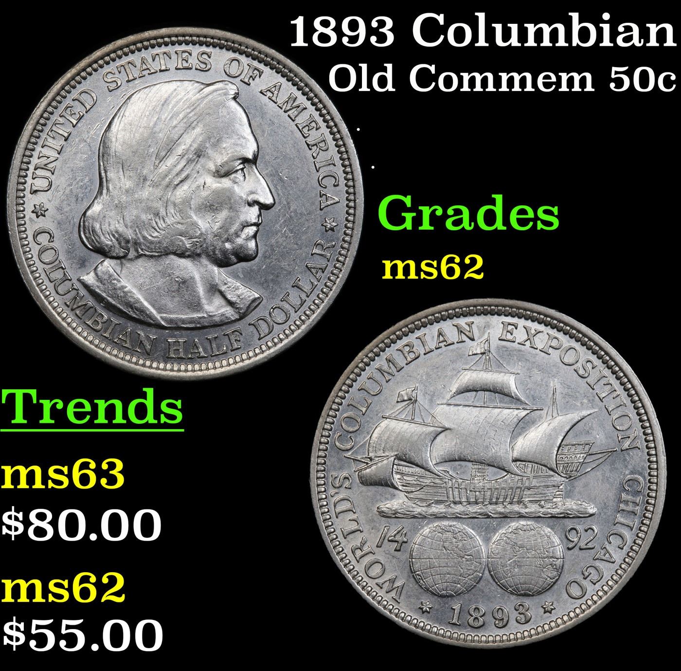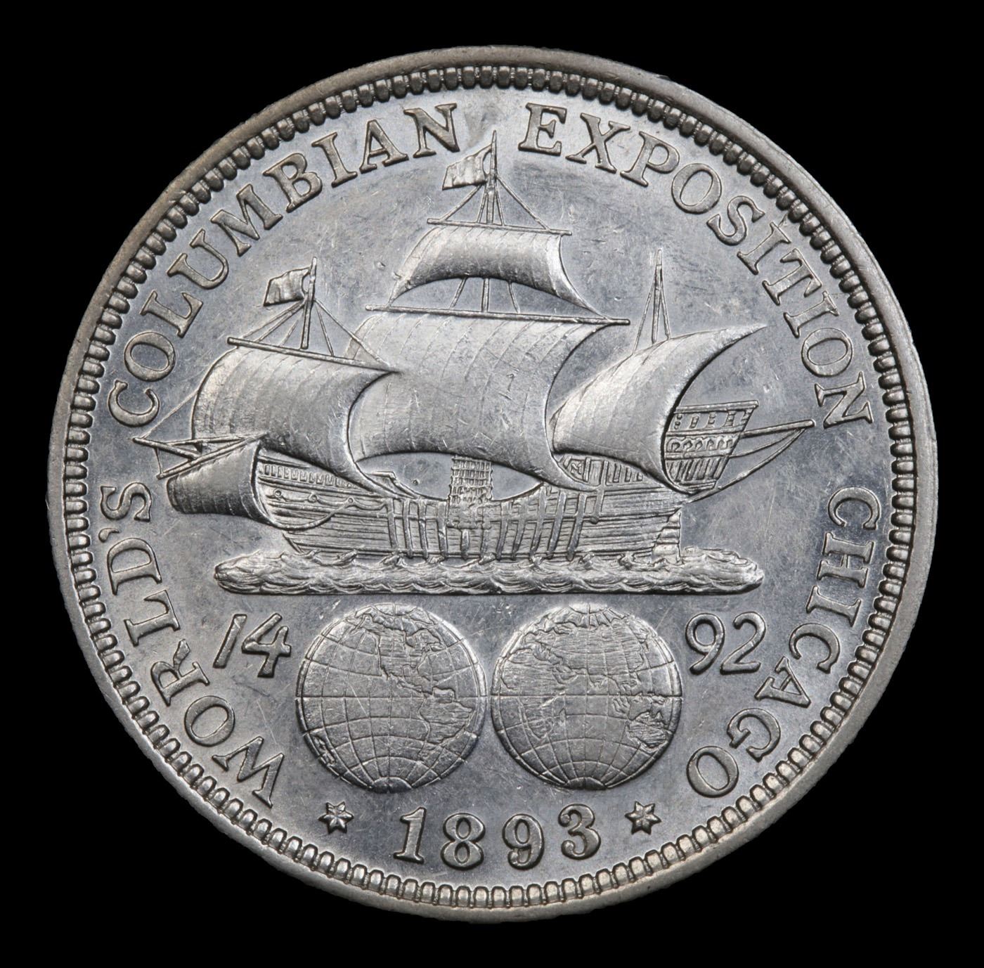 1893 Columbian Old Commem Half Dollar 50c Grades Select Unc. The Columbus Half Dollar along with the Isabella Quarter were Minted in Honor of the 400th Anniversary of Columbus' Voyage to the New World. It was First Distributed at the Worlds Fair Honoring that Voyage. When examining a Columbian Exposition Half Dollar, the First Points to Show Wear are Columbus’ Eyebrow, Cheek and the Hair Behind his Forehead and Jaw. On the Reverse, Check the Foresail and Sainsail, as well as the Right Side of the Eastern Hemisphere.