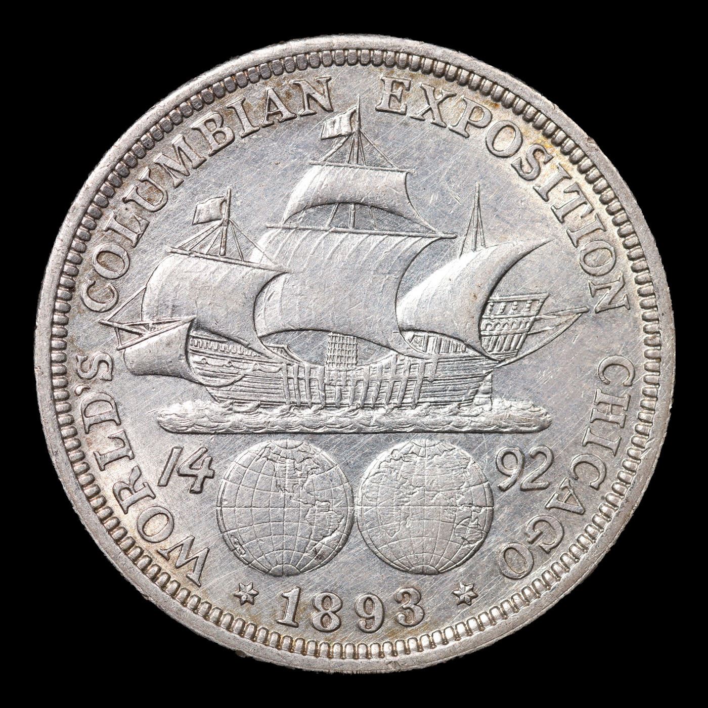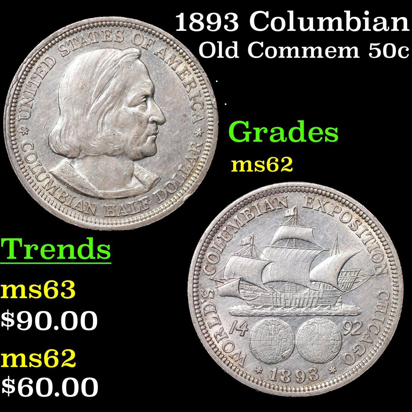 1893 Columbian Old Commem Half Dollar 50c Grades Select Unc. The Columbus Half Dollar along with the Isabella Quarter were Minted in Honor of the 400th Anniversary of Columbus' Voyage to the New World. It was First Distributed at the Worlds Fair Honoring that Voyage. When examining a Columbian Exposition Half Dollar, the First Points to Show Wear are Columbus’ Eyebrow, Cheek and the Hair Behind his Forehead and Jaw. On the Reverse, Check the Foresail and Sainsail, as well as the Right Side of the Eastern Hemisphere.