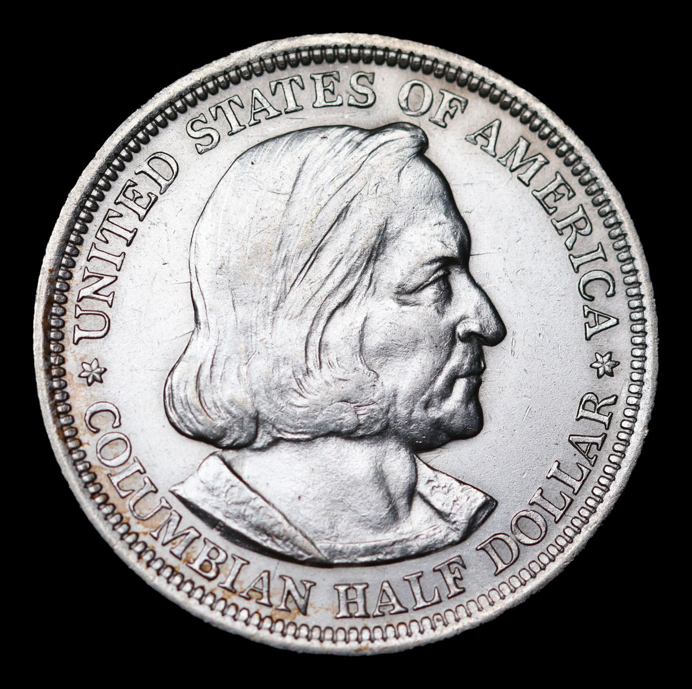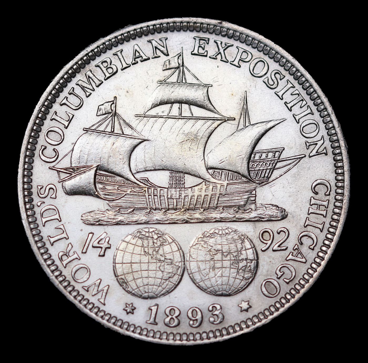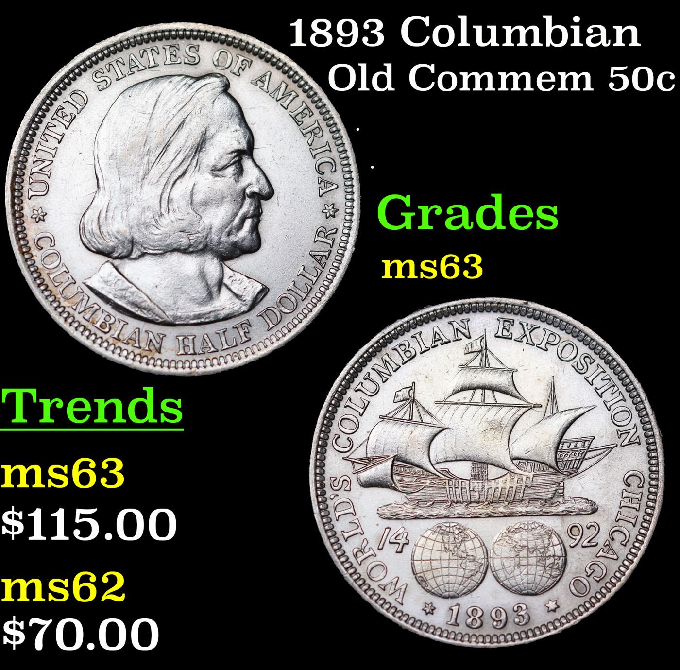 1893 Columbian Old Commem Half Dollar 50c Grades Select Unc. The Columbus Half Dollar along with the Isabella Quarter were Minted in Honor of the 400th Anniversary of Columbus' Voyage to the New World. It was First Distributed at the Worlds Fair Honoring that Voyage. When examining a Columbian Exposition Half Dollar, the First Points to Show Wear are Columbus’ Eyebrow, Cheek and the Hair Behind his Forehead and Jaw. On the Reverse, Check the Foresail and Sainsail, as well as the Right Side of the Eastern Hemisphere.
