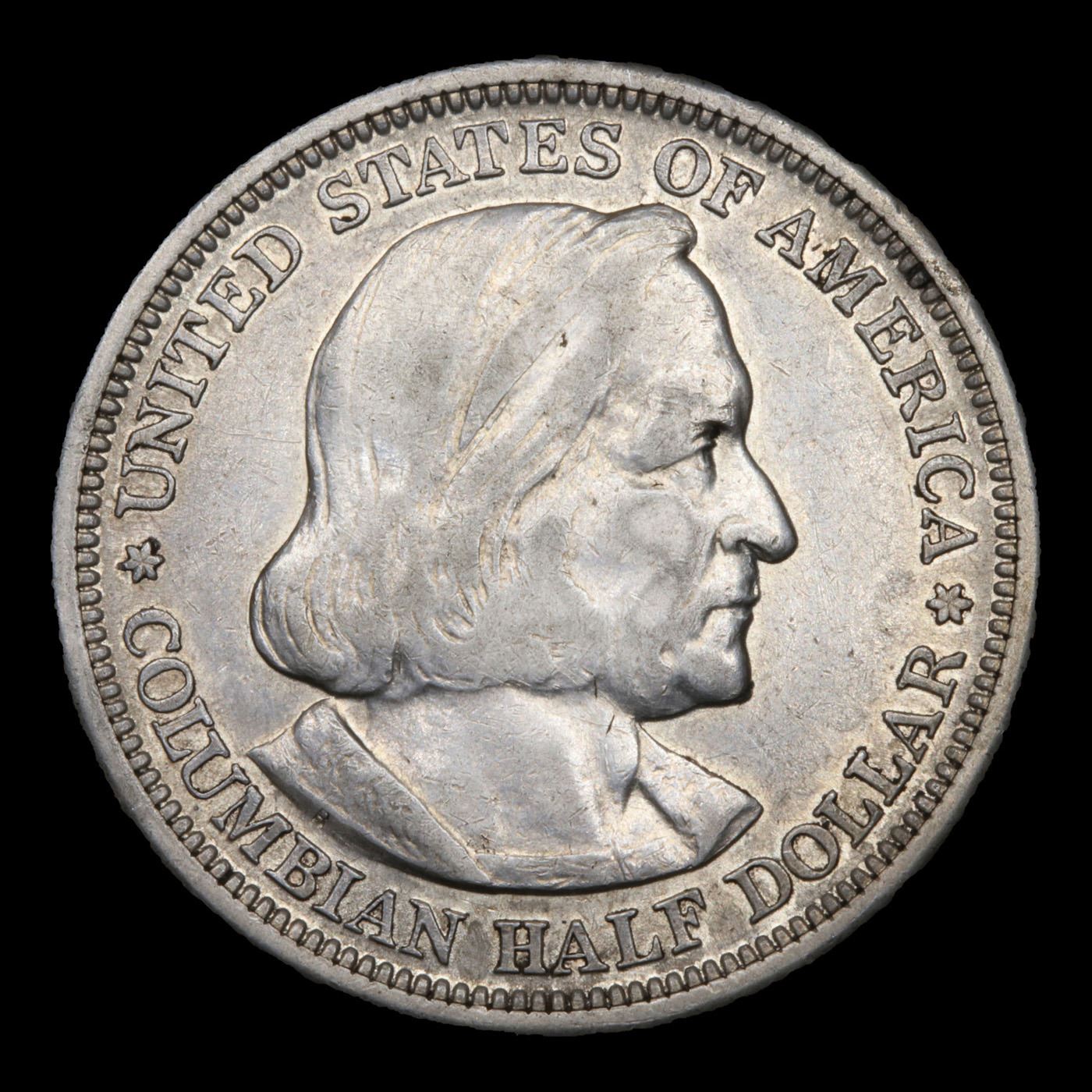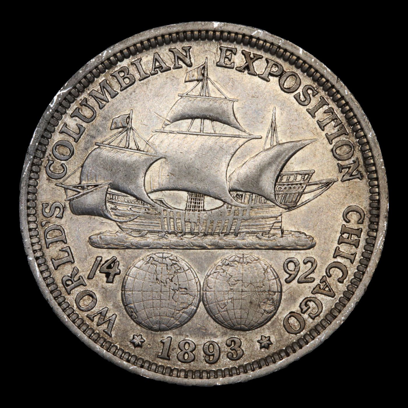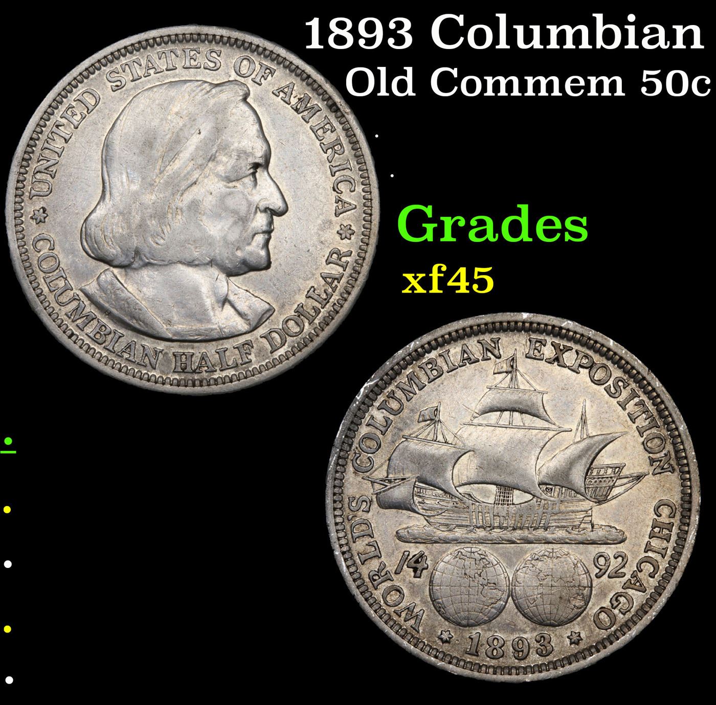 1893 Columbian Old Commem Half Dollar 50c Grades xf+. The Columbus Half Dollar along with the Isabella Quarter were Minted in Honor of the 400th Anniversary of Columbus' Voyage to the New World. It was First Distributed at the Worlds Fair Honoring that Voyage. When examining a Columbian Exposition Half Dollar, the First Points to Show Wear are ColumbusÕ Eyebrow, Cheek and the Hair Behind his Forehead and Jaw. On the Reverse, Check the Foresail and Sainsail, as well as the Right Side of the Eastern Hemisphere.