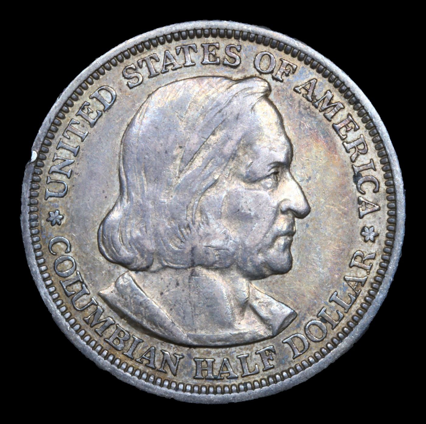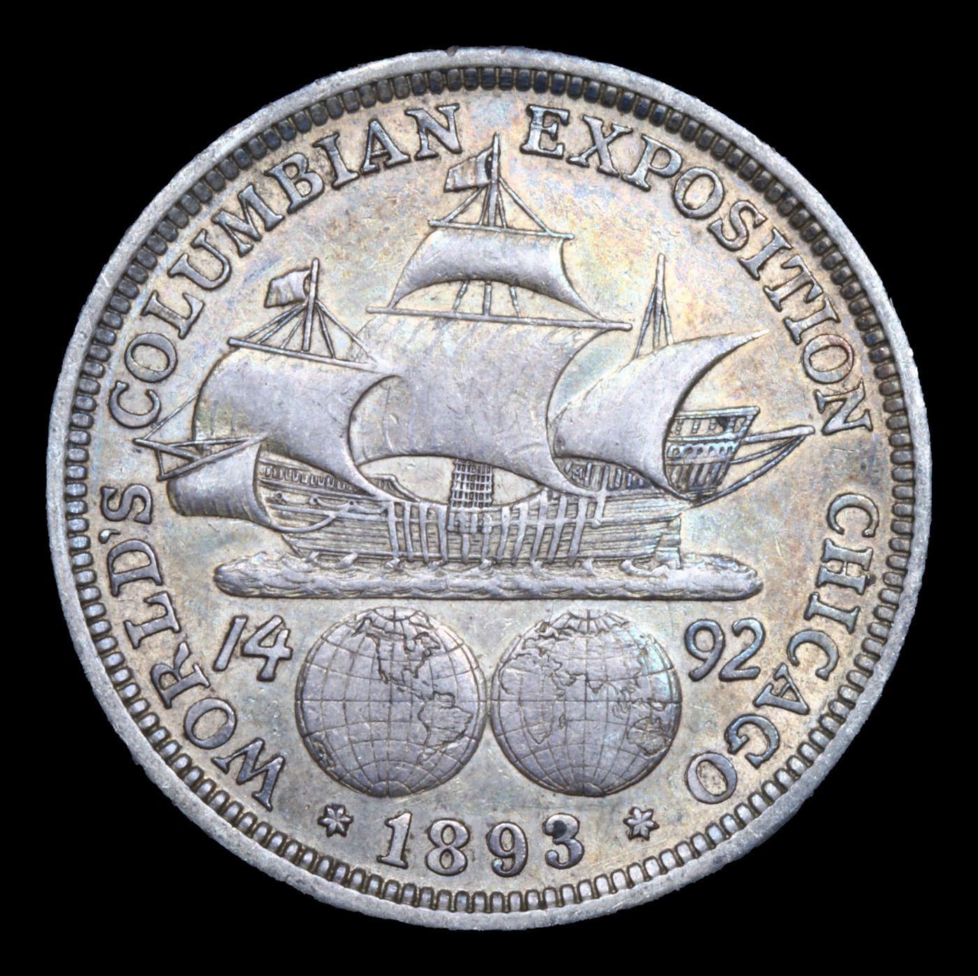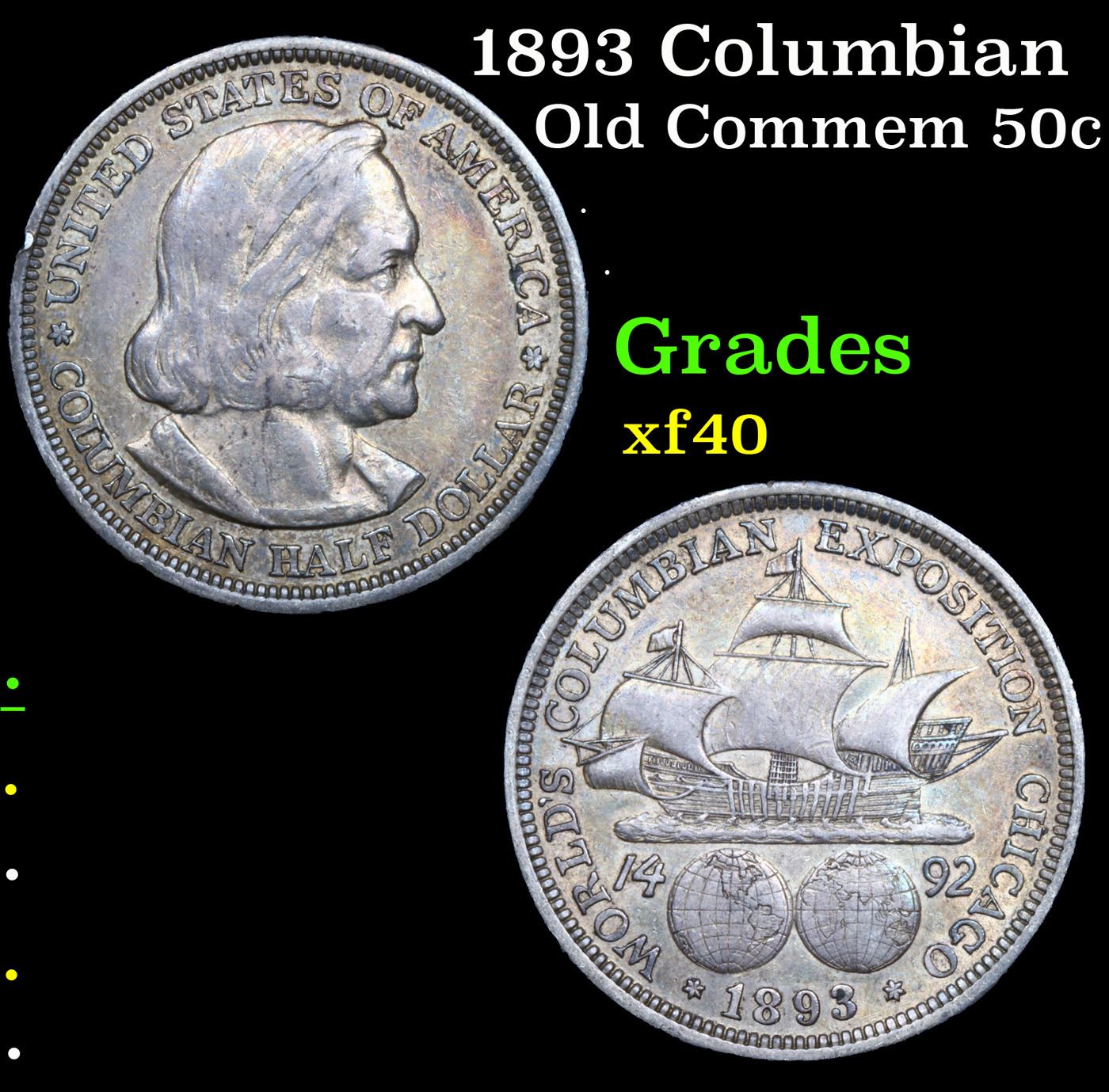 1893 Columbian Old Commem Half Dollar 50c Grades xf. The Columbus Half Dollar along with the Isabella Quarter were Minted in Honor of the 400th Anniversary of Columbus' Voyage to the New World. It was First Distributed at the Worlds Fair Honoring that Voyage. When examining a Columbian Exposition Half Dollar, the First Points to Show Wear are Columbus’ Eyebrow, Cheek and the Hair Behind his Forehead and Jaw. On the Reverse, Check the Foresail and Sainsail, as well as the Right Side of the Eastern Hemisphere.