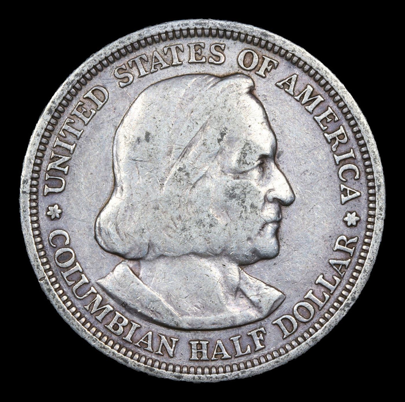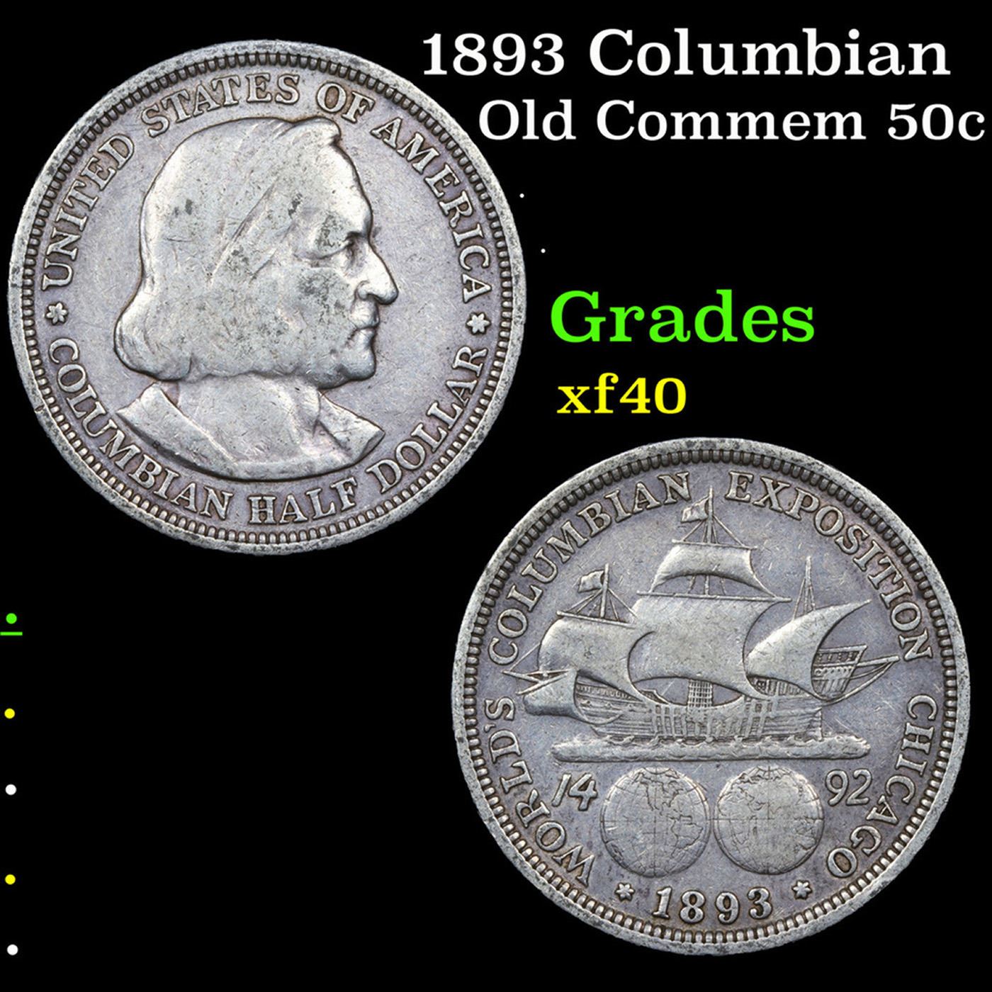 1893 Columbian Old Commem Half Dollar 50c Grades xf. The Columbus Half Dollar along with the Isabella Quarter were Minted in Honor of the 400th Anniversary of Columbus' Voyage to the New World. It was First Distributed at the Worlds Fair Honoring that Voyage. When examining a Columbian Exposition Half Dollar, the First Points to Show Wear are Columbus’ Eyebrow, Cheek and the Hair Behind his Forehead and Jaw. On the Reverse, Check the Foresail and Sainsail, as well as the Right Side of the Eastern Hemisphere.