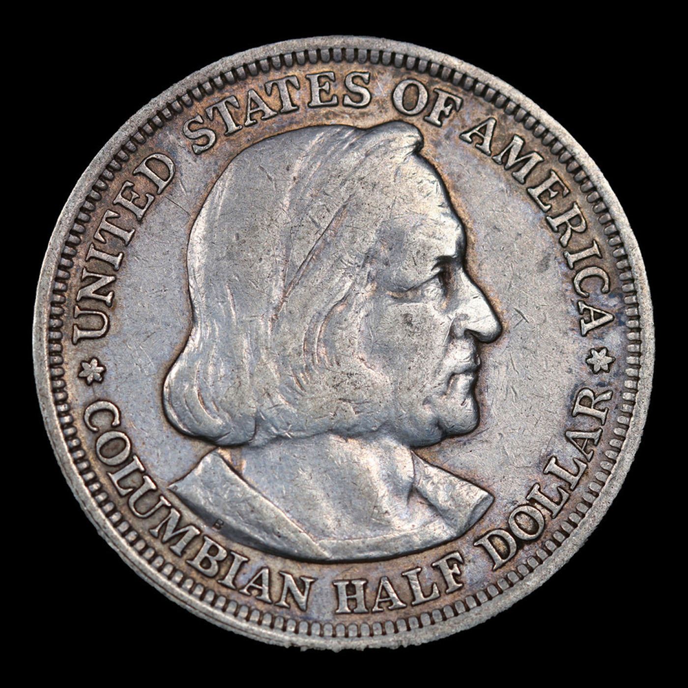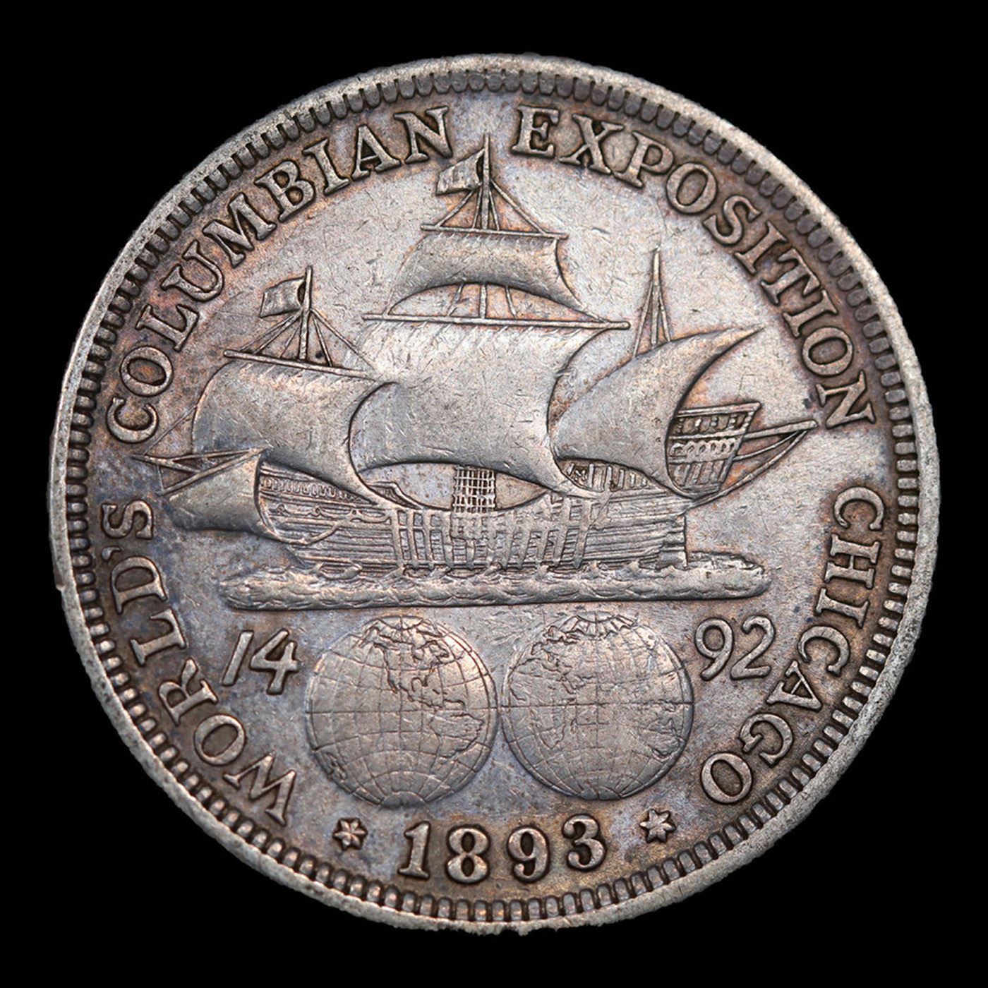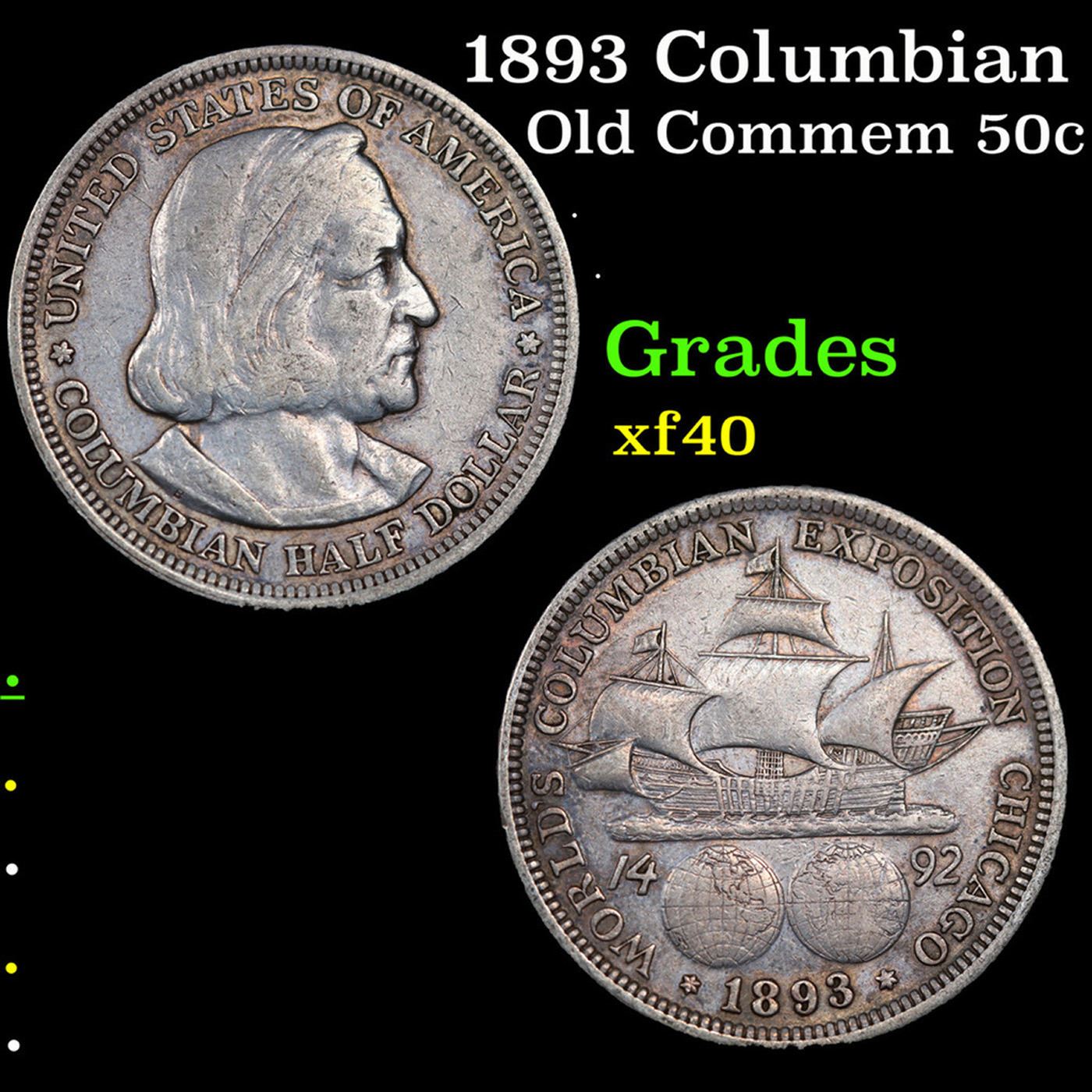 1893 Columbian Old Commem Half Dollar 50c Grades xf. The Columbus Half Dollar along with the Isabella Quarter were Minted in Honor of the 400th Anniversary of Columbus' Voyage to the New World. It was First Distributed at the Worlds Fair Honoring that Voyage. When examining a Columbian Exposition Half Dollar, the First Points to Show Wear are Columbus’ Eyebrow, Cheek and the Hair Behind his Forehead and Jaw. On the Reverse, Check the Foresail and Sainsail, as well as the Right Side of the Eastern Hemisphere.