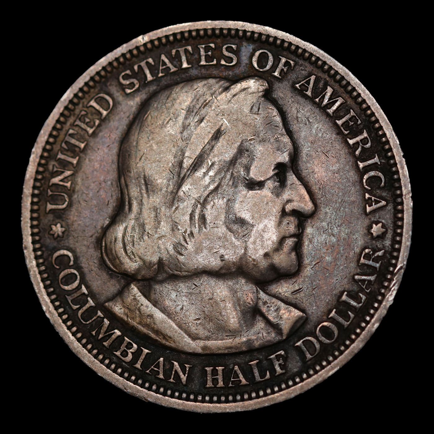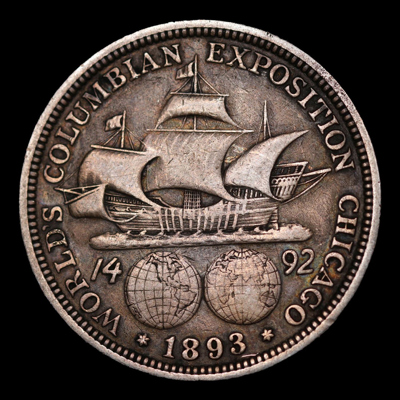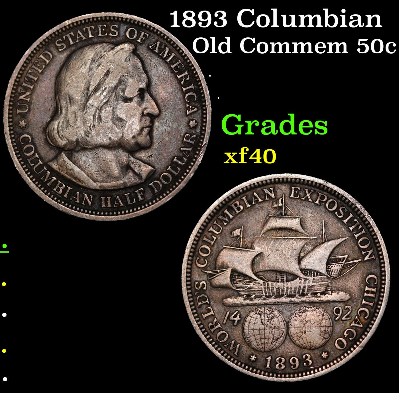 1893 Columbian Old Commem Half Dollar 50c Grades xf. The Columbus Half Dollar along with the Isabella Quarter were Minted in Honor of the 400th Anniversary of Columbus' Voyage to the New World. It was First Distributed at the Worlds Fair Honoring that Voyage. When examining a Columbian Exposition Half Dollar, the First Points to Show Wear are Columbus’ Eyebrow, Cheek and the Hair Behind his Forehead and Jaw. On the Reverse, Check the Foresail and Sainsail, as well as the Right Side of the Eastern Hemisphere.