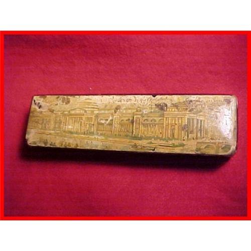This 7-3/4" long black lacquer pencil box is a souvenir of the 1893 Chicago Columbian Exposition. The yellow paper graphics on the lid is of the Agricultural Building(SEE PHOTO). Good condition with some scuffing, minor crazing and chipping. No maker's marking on this antique hinged pencil box. I bought this at a local estate auction over 20 years ago.