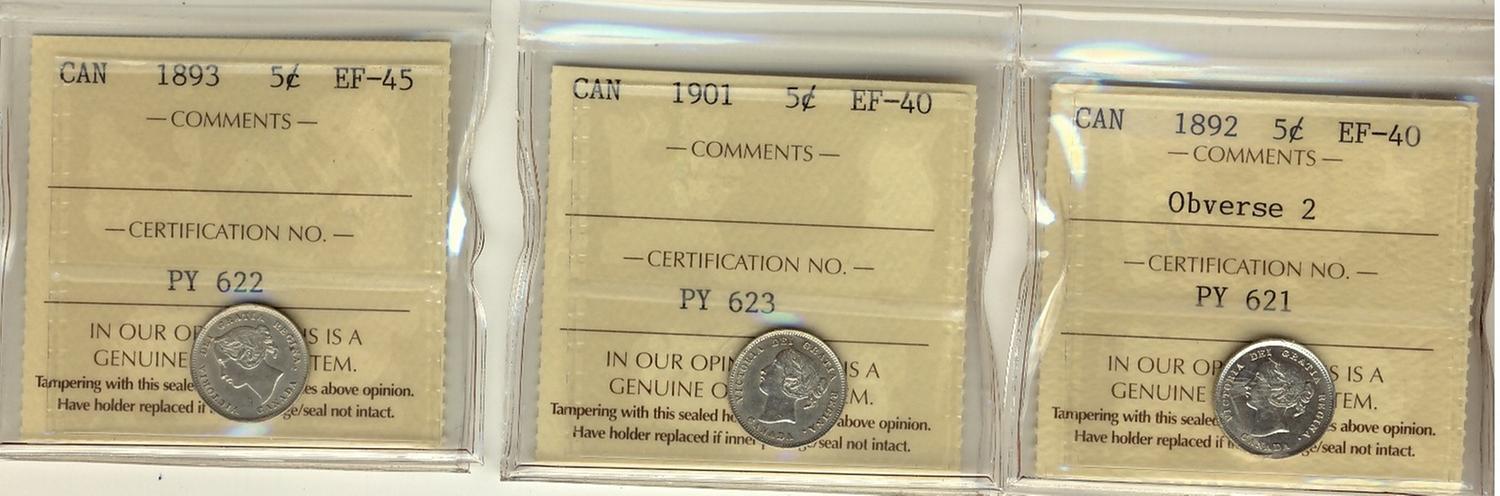 1893 EF45, 1892 Obv 2 & 1901 5¢ ICCS EF40. Lot of 3 coins.