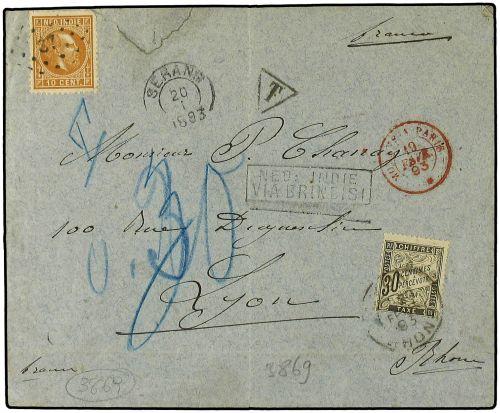 1893 Envelope to FRANCE bearing 10 cents brown (SG 4) tied by SERANG 37 in numeral, routed via Weltevreden with boxed instructional NED INDIE VIA BRINDISI, underpaid with TAX handstamp and French postage due 30 cents black (Yvert 18) applied and tied on arrival in Lyon. Fine item of underpaid mail from the Dutch Indies.