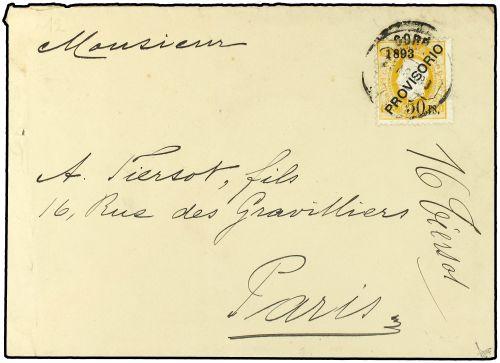 1893 Envelope to FRANCE bearing 50 on 80 r plae orange (SG 310) overprint PROVISORIO cancelled by LIBOA datestamp with PARIS arrival. Very scarce single franking on cover.