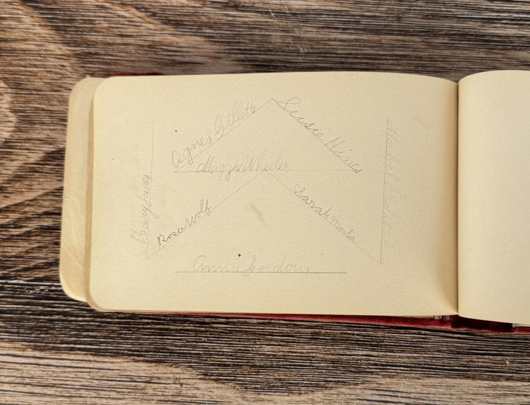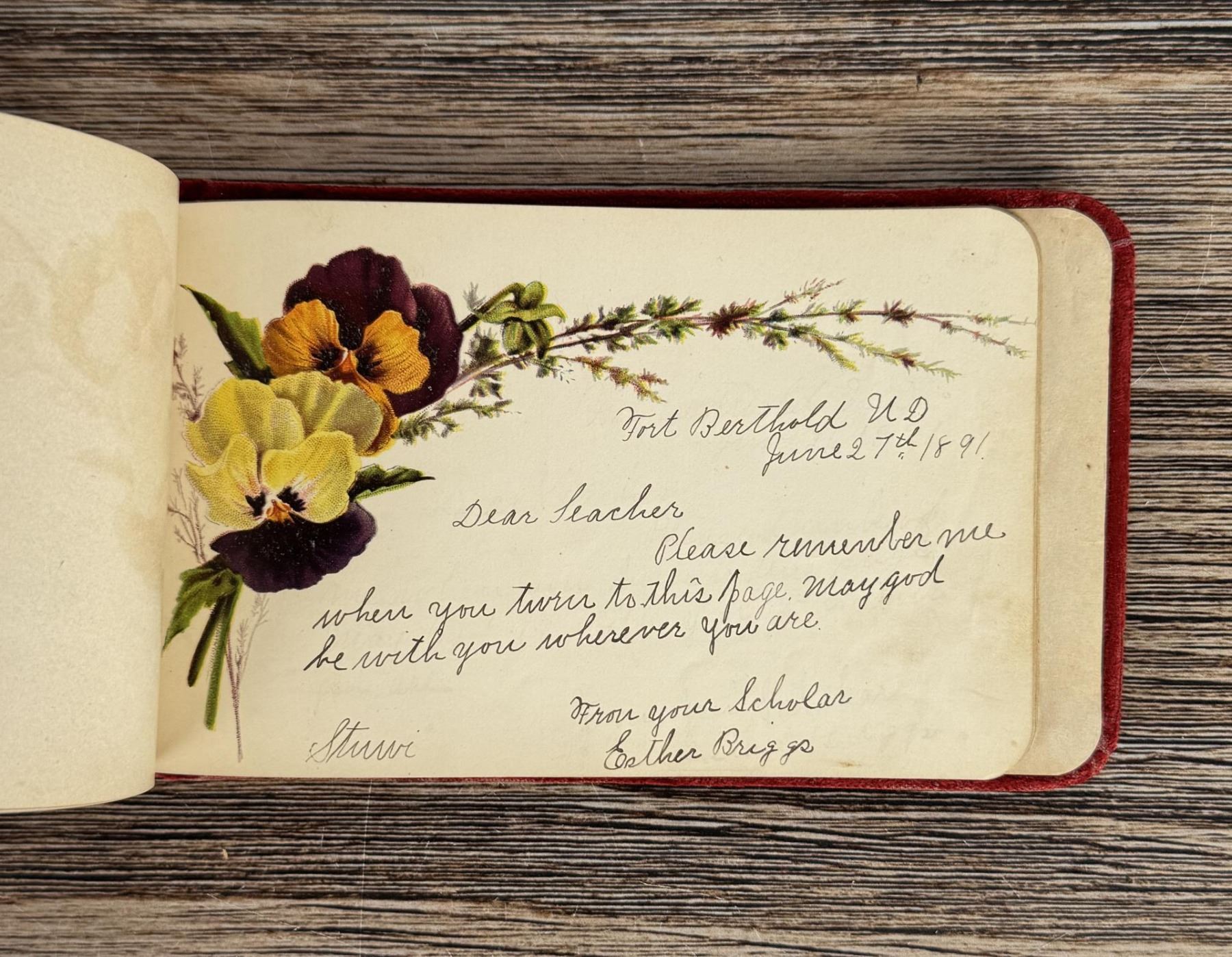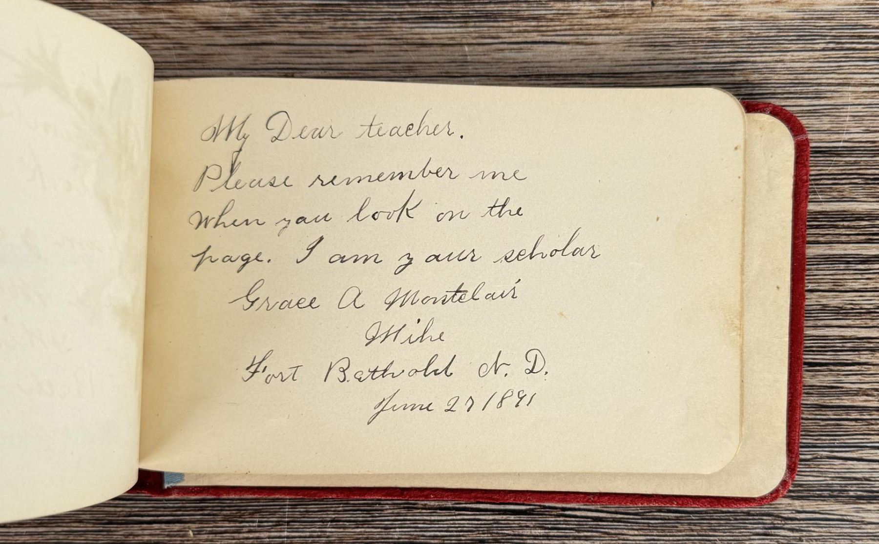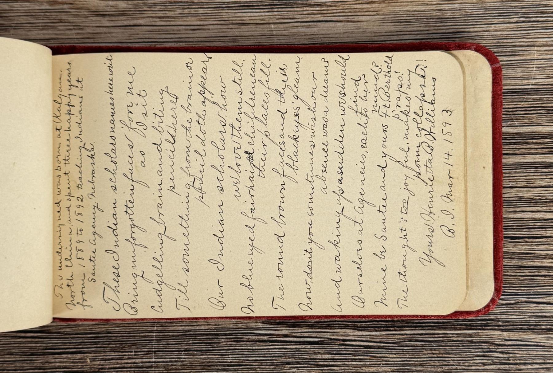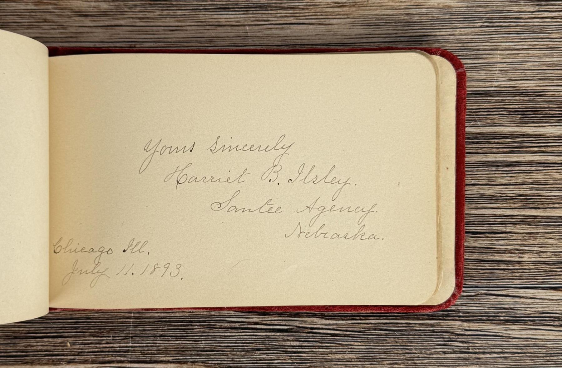 Notable Names include Henrietta B. Williams a Chinese Born Missionary that was a teacher at the Santee Indian Agency, Hannah Hall Fort Berthold (Daughter of Reverend C.L. Hall Indian Agency), Roanna F. Challis (Teacher at Fort Berthold), Katie Eagle (Fort Berthold Student), Frank and Mina Tobie (Husband and Wife Teachers at Fort Berthold), Otta Wolf (Student at Fort Berthold), Running Face (aka Howard Mandan) the son of Red Buffalo Cow, Peter Standish (Student at Forth Berthold), Harriet B. Ilsley (Teacher at Fort Berthold), Miss E. Jean Kennedy (Matron Santee Agency), Esther Briggs (Student at Fort Berthold), Albert Gillette (Student at Fort Berthold), Thomas White (Student at Fort Berthold), Stella Rogers Howling Wolf (Student at Fort Berthold), Walter King (Student at Fort Berthold), Ernest Wilkinson (Student at Fort Berthold), Jesse Mason (Student at Fort Berthold), Nathan Gunn (Student at Fort Berthold), Grace Montclair (Student at Fort Berthold), Gerald Gillette (Student at Fort Berthold). Provenance: Aline Natalie Burgess Claremont Los Angeles, daughter of James Gregor Burgess builder of the Burgess Baptist Church Crow Agency Montana, through Decent.