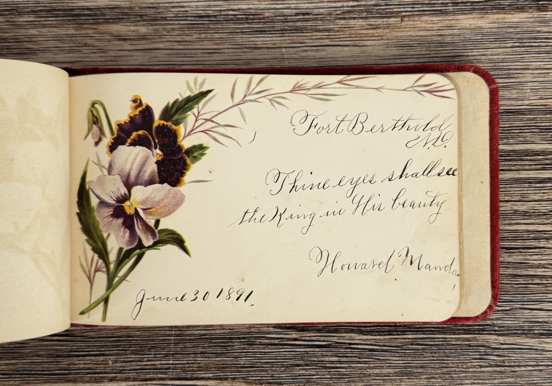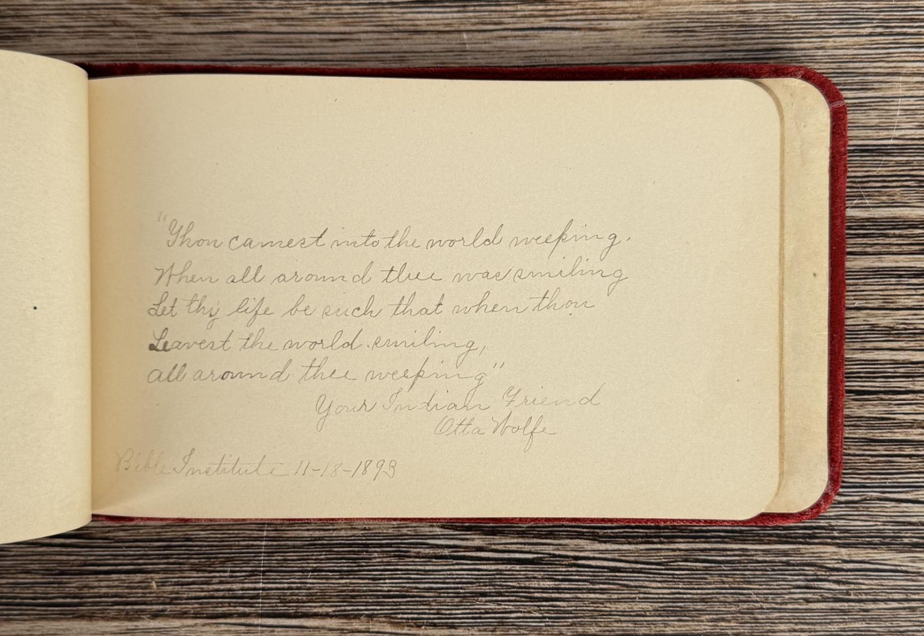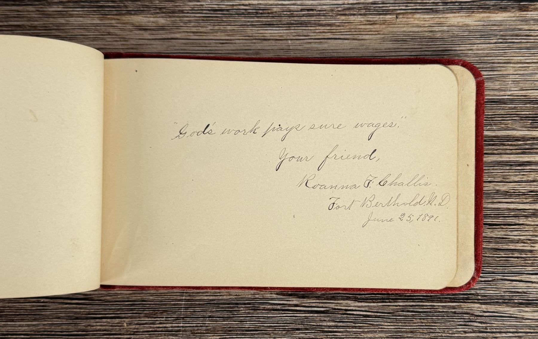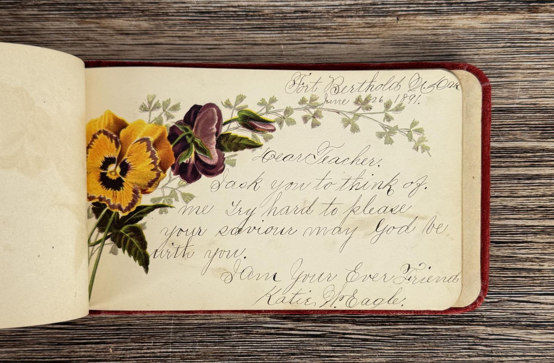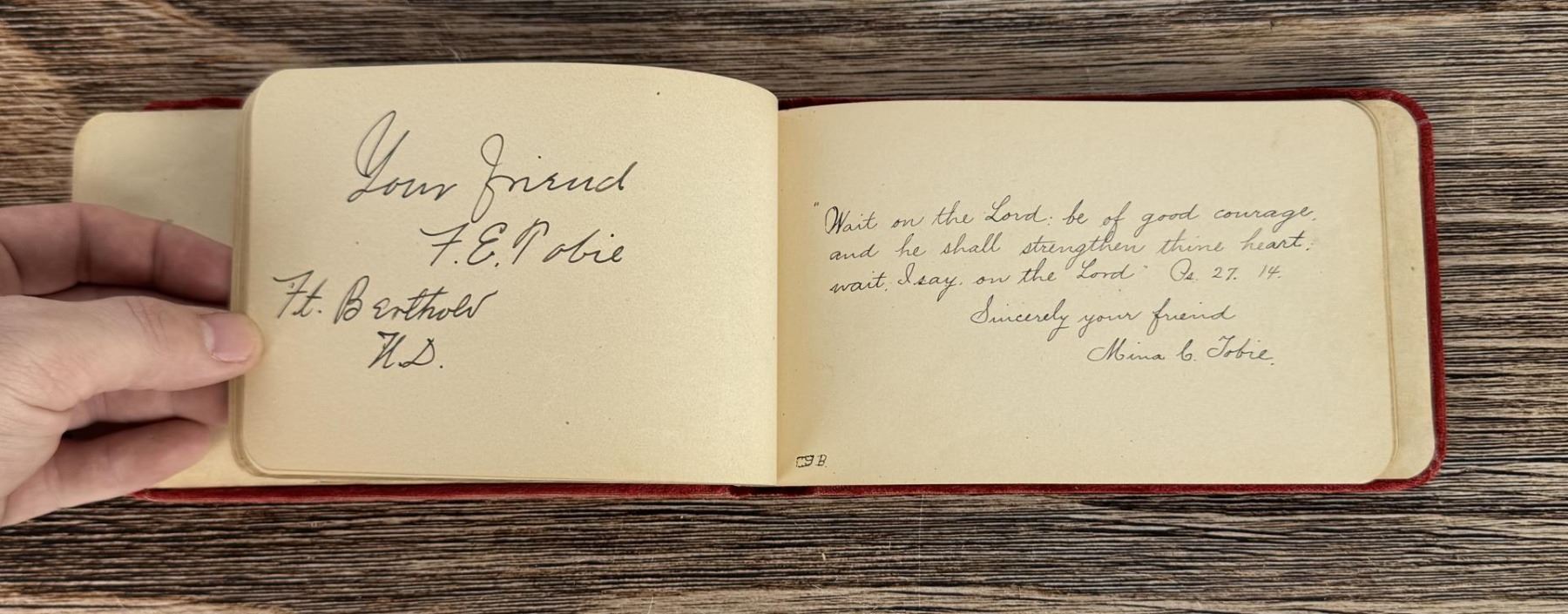Notable Names include Henrietta B. Williams a Chinese Born Missionary that was a teacher at the Santee Indian Agency, Hannah Hall Fort Berthold (Daughter of Reverend C.L. Hall Indian Agency), Roanna F. Challis (Teacher at Fort Berthold), Katie Eagle (Fort Berthold Student), Frank and Mina Tobie (Husband and Wife Teachers at Fort Berthold), Otta Wolf (Student at Fort Berthold), Running Face (aka Howard Mandan) the son of Red Buffalo Cow, Peter Standish (Student at Forth Berthold), Harriet B. Ilsley (Teacher at Fort Berthold), Miss E. Jean Kennedy (Matron Santee Agency), Esther Briggs (Student at Fort Berthold), Albert Gillette (Student at Fort Berthold), Thomas White (Student at Fort Berthold), Stella Rogers Howling Wolf (Student at Fort Berthold), Walter King (Student at Fort Berthold), Ernest Wilkinson (Student at Fort Berthold), Jesse Mason (Student at Fort Berthold), Nathan Gunn (Student at Fort Berthold), Grace Montclair (Student at Fort Berthold), Gerald Gillette (Student at Fort Berthold). Provenance: Aline Natalie Burgess Claremont Los Angeles, daughter of James Gregor Burgess builder of the Burgess Baptist Church Crow Agency Montana, through Decent.