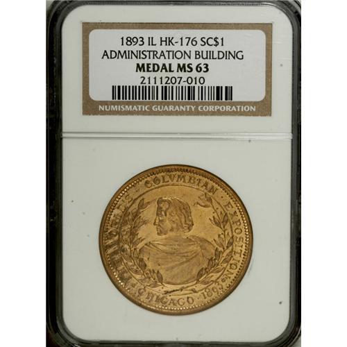 <B>1893 Administration Building, Exhibition Palace Dollar, Columbian World's Fair, MS63 NGC.</B></I> HK-176. One of a series of palace dollars issued during the World's Fair. Listed as "scarce" in the so-called dollar catalog by Hibler and Kappen.<BR><BR><b>Shipping:</b> Coin/Currency (<a target="_blank" href="http://www.heritageauctions.com/common/shipping.php">view shipping information</a>)