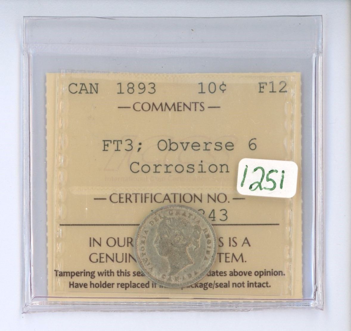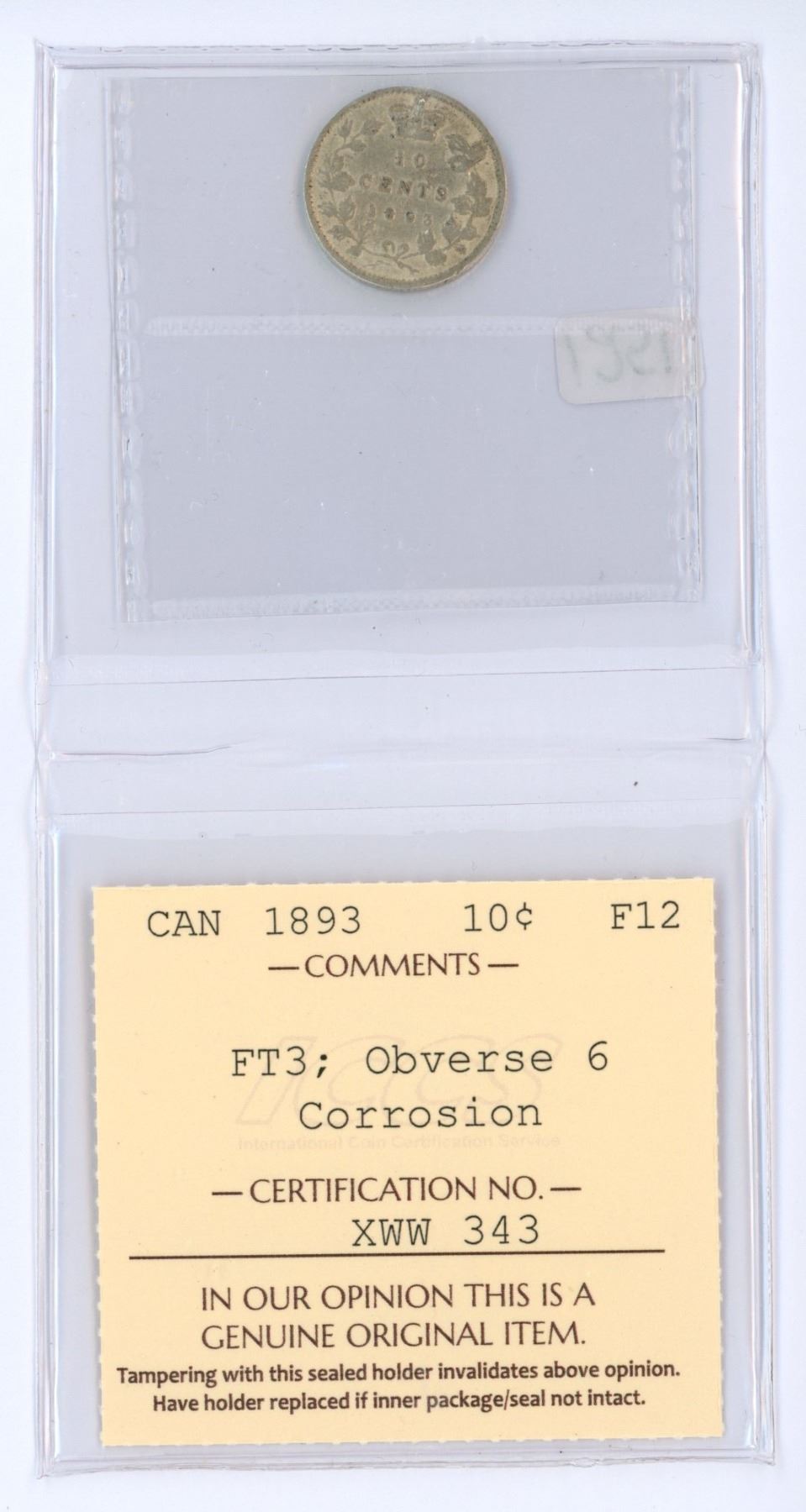1893 ICCS graded, Canadian silver 10 cent coin - F12