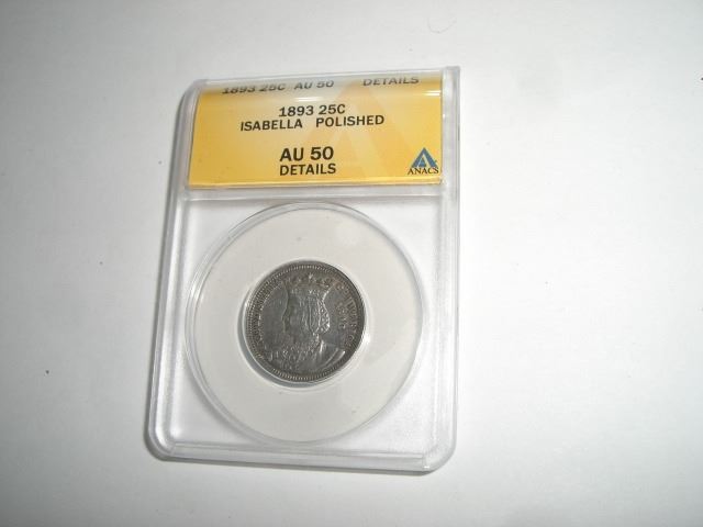 1893 ISABELLA WORLDS COLUMBIAN EXPOSITION-CHICAGO 25 CENT COMMEMORATIVE *EXTREMELY RARE KEY DATE* SILVER QUARTER DOLLAR CERTIFIED BY ANACS AU-50 RED BOOK VALUE IS $500.00+!! CERTIFIED COIN CAME OUT OF SAFE BOX!! ***Coin, Currency & All Items Listed in this auction - Grades, Conditions and Values are not Safe Deposit Coins LLC Responsibilty. Grades, Condition and Values are determined by Consigner(s) & Buyers