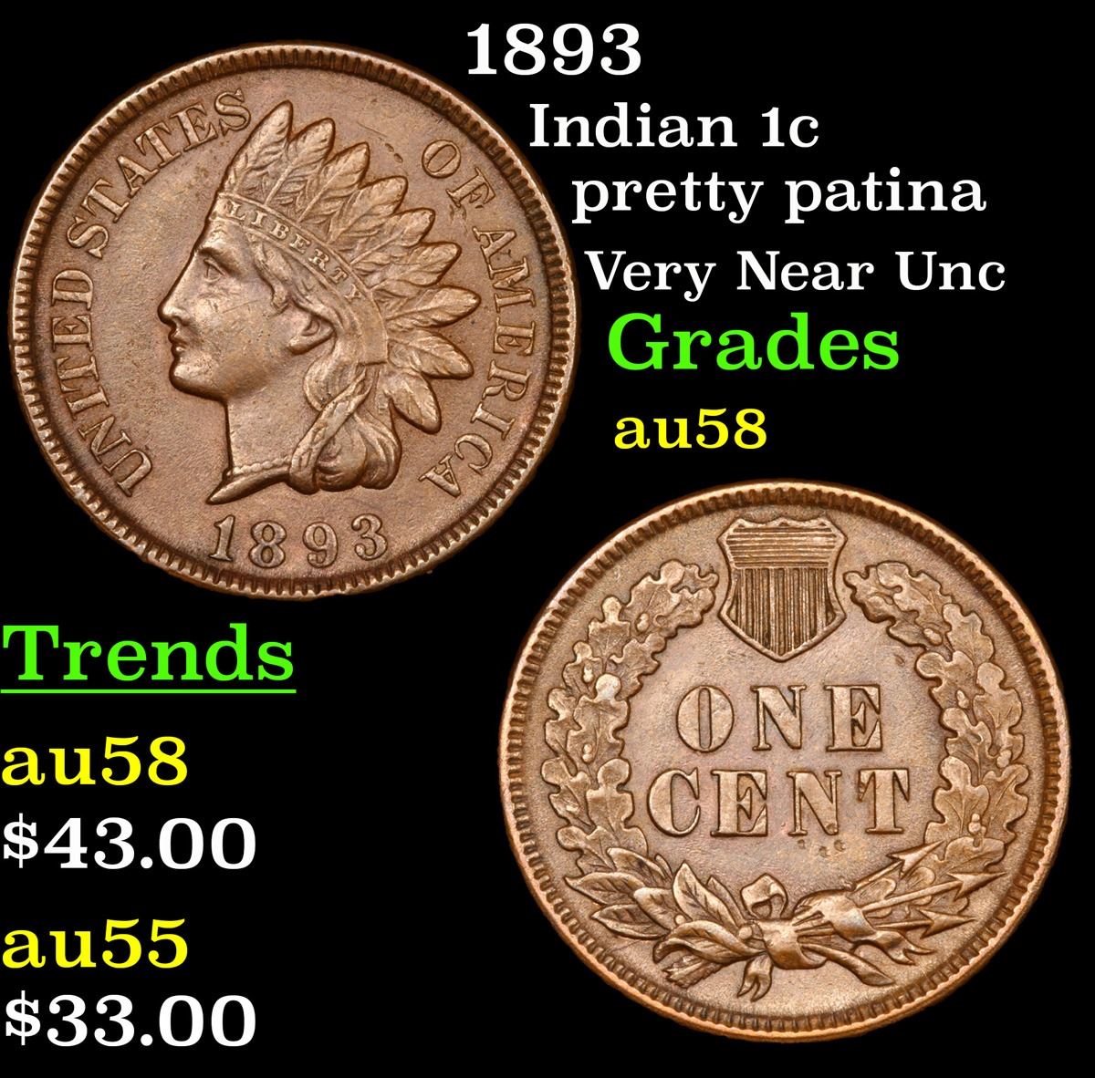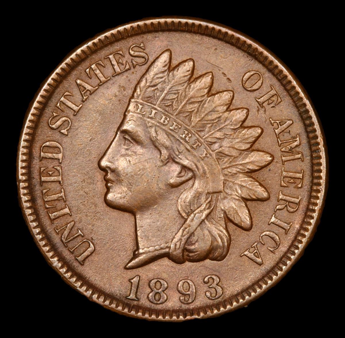 1893 Indian Cent 1c Grades Choice AU/BU Slider.