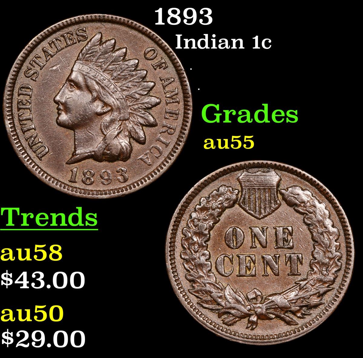 1893 . . Indian Cent 1c Grades Choice AU.
