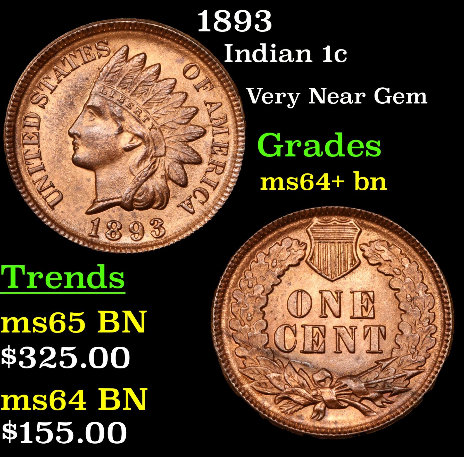 1893 . Very Near Gem Indian Cent 1c Grades Choice+ Unc BN.