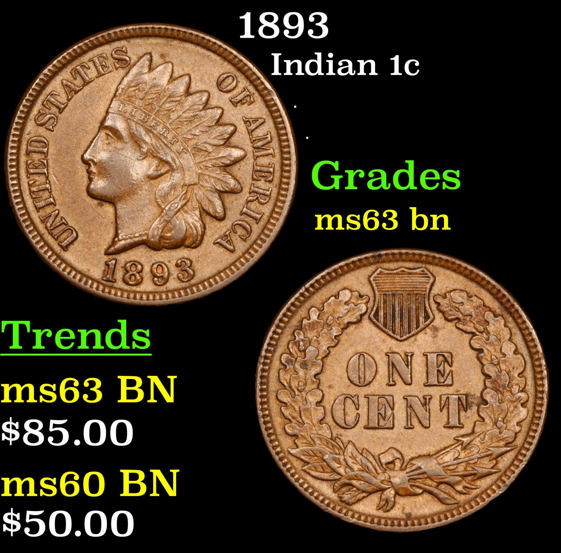 1893 Indian Cent 1c Grades Select Unc BN.