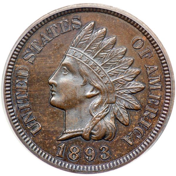 1893 Indian Head Cent. PCGS graded Proof 64 Brown. Lovely shades of blue and brown toning. Pop 16; 4 finer. Only 2,195 pieces struck (PCGS # 2366) .