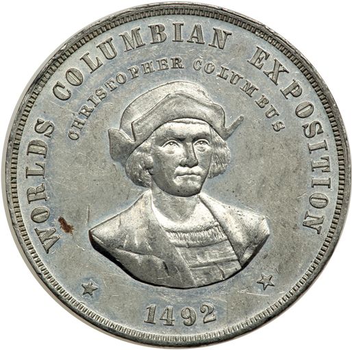 1893 Indiana Building Souvenir Medal, Eglit-11. White metal, 37mm. Columbus bust on obverse. Indiana Building on reverse. Uncirulated with light haze in fields but traces of proof-like surfaces. Rarely seen in higher grades.