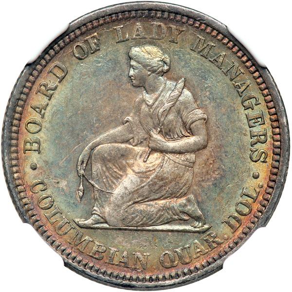 1893 Isabella Quarter Dollar. NGC graded MS-62+. CAC Approved. Lovely rainbow toning on both sides, a select example that features bold relief on the portrait of Queen Isabella (PCGS # 9220) .