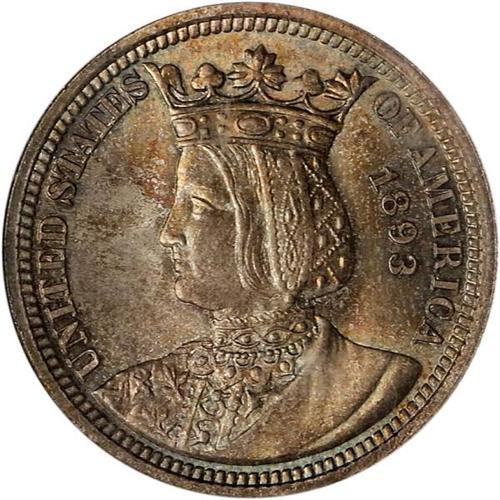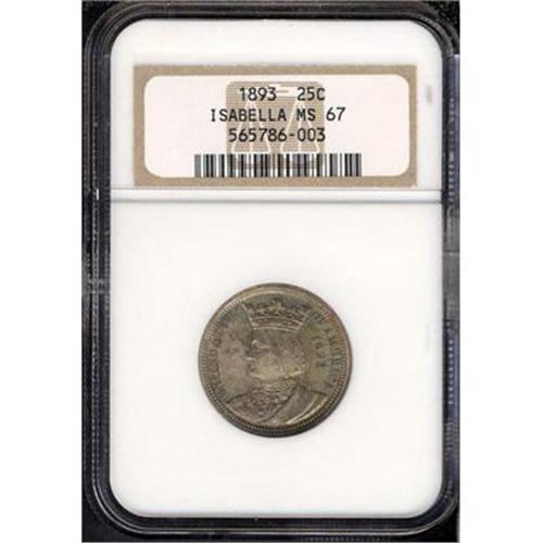 <b>1893 Isabella Quarter Dollar. NGC graded MS67.</b> Tremendous detail from very careful preservation, which collectors like better to see than wishy-washy dullness; furthermore, the surfaces show beautiful silver color interspersed with the toning. All devices were struck with such force and determination by the dies that elements show with razor-edge detail. The portrait on this American coin is that of Queen Isabella of Spain from the time that she funded the voyage of Christopher Columbus to the New World. She is wearing a crown and a jewel-encrusted snood <b>(PCGS # 9220)</b> <i>