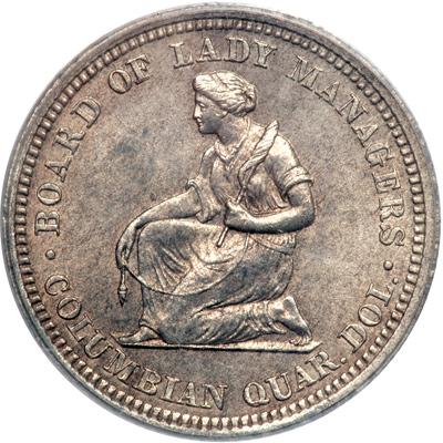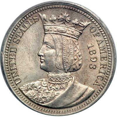 1893 Isabella Quarter Dollar. PCGS graded MS-63. Appealing steel grey shades. The strike is full, including the jeweled crown, Liberty's frilly blouse, and the design of the hair net or "snood" as it is called. Only 24,214 minted (PCGS # 9220) .