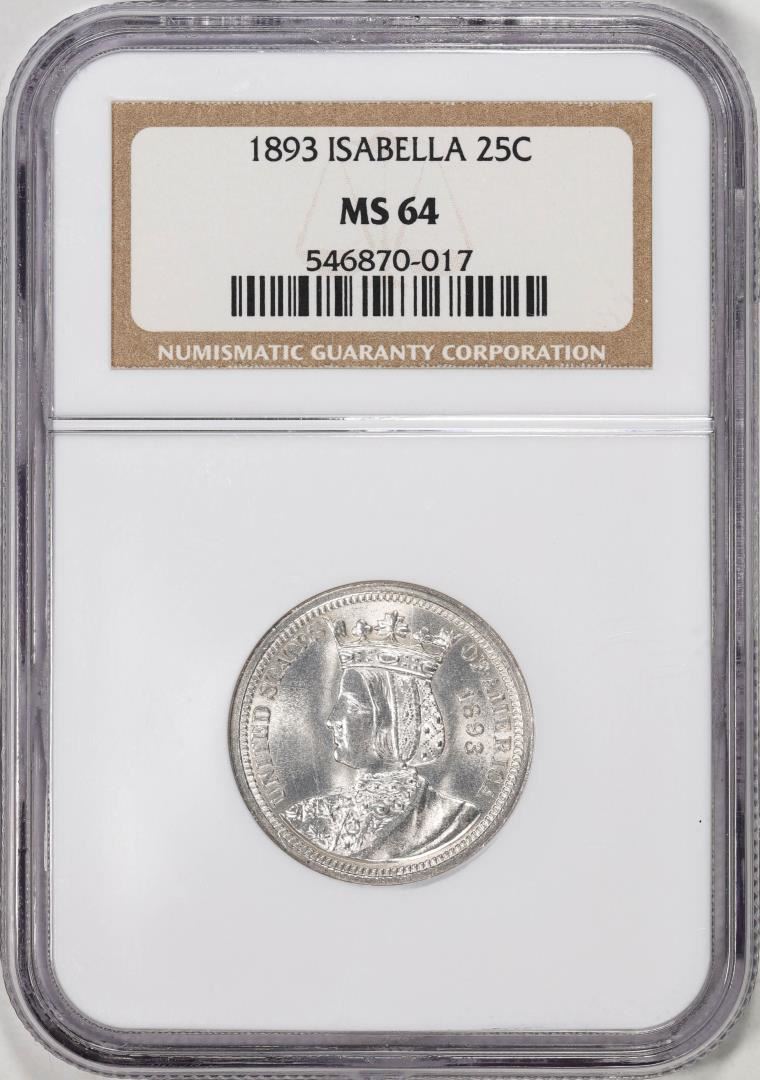 One 1893 Isabella Commemorative Quarter Coin NGC MS64. NGC Certified.