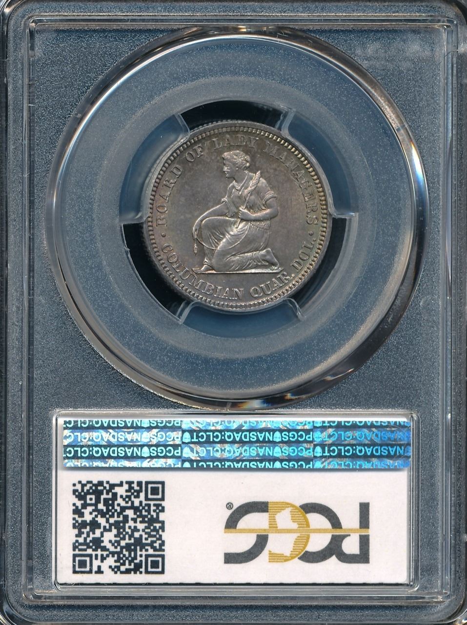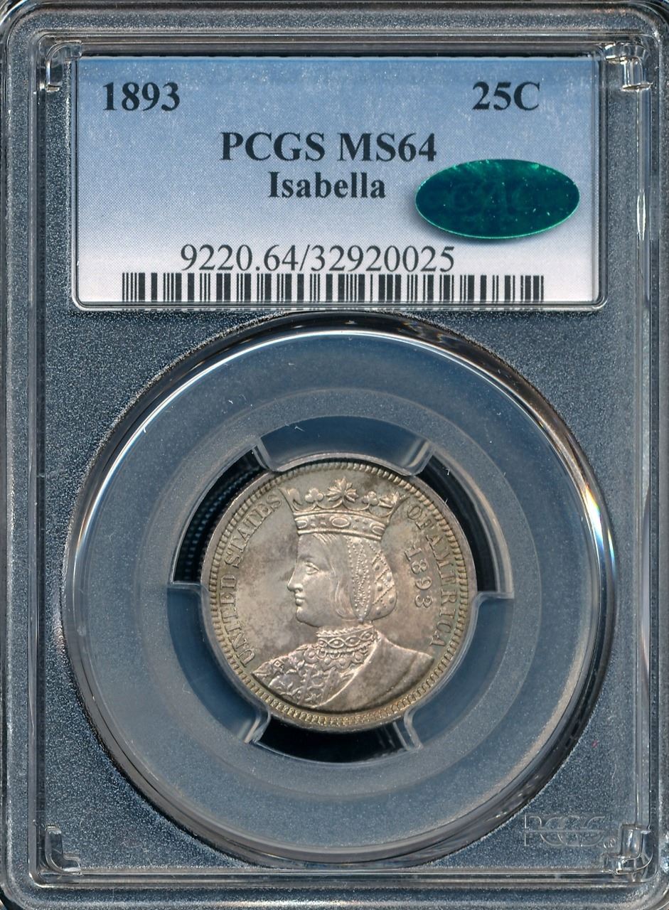 In 1893, the Board of Lady Managers of the World’s Columbian Exposition petitioned for a souvenir quarter dollar and on March 3rd authority was granted. The obverse has the crowned bust of Queen Isabella I of Spain. The kneeling female on the reverse with distaff and spindle is emblematic of women’s industry. This example has splendid eye appeal due to the toning that includes shades of blue, green, amber and rose. The CAC sticker confirms the strength of the coin for the grade.