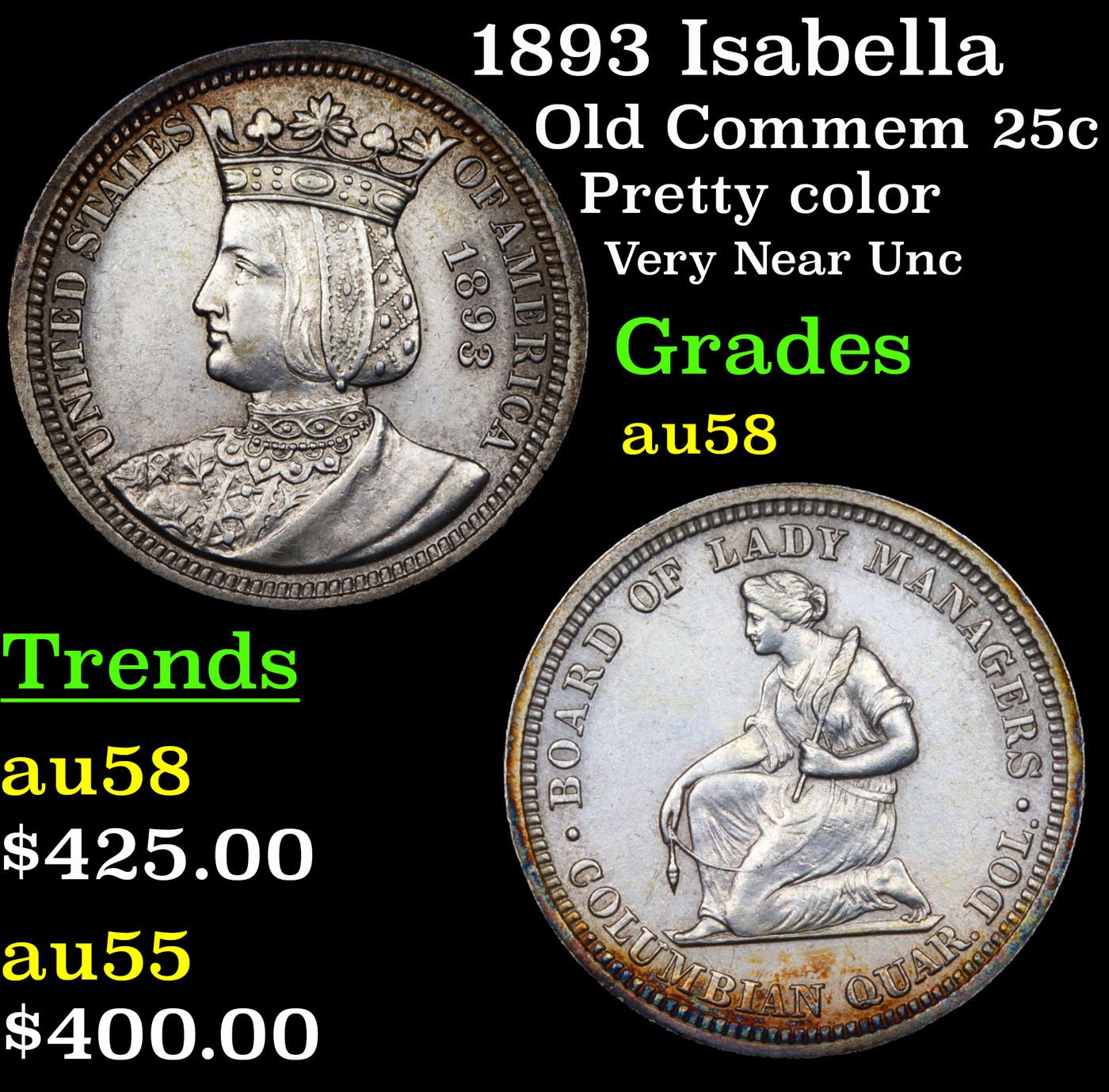 1893 Isabella Isabella Quarter 25c Grades Choice AU/BU Slider. When Examining an Isabella Quarter on the Obverse, wear first shows in the area of the CrownÕs Central Oval Jewel and on IsabellaÕs cheek. Reverse wear will first be noted on the Strand of Wool Resting on the Kneeling SpinnerÕs Thigh. Due to Die Wear, Raised or Sharp Definition of the Strand of Wool is not the norm. This area can display a Slight Weakness of Strike, which is par for the Design and should not be Labeled Wear. In January 1893, well after the Columbian half dollar was a reality, Mrs. Potter Palmer, well-known Chicago socialite, patron of the arts, and grande dame of the Exposition,[1] suggested to the Appropriations Committee of the House of Representatives that $10,000 of the money earmarked for the Board of Lady Managers of the World's Columbian Exposition be given in the form of a special issue of souvenir (as they were called) quarter dollars. This was translated into a law approved March 3, 1893, which stated that the production of these quarters would not exceed 40,000 and that the pieces would be of standard weight and fineness. Like the Columbian half dollars, the quarters would be made from metal taken from uncurrent silver coins held by the Treasury Department.