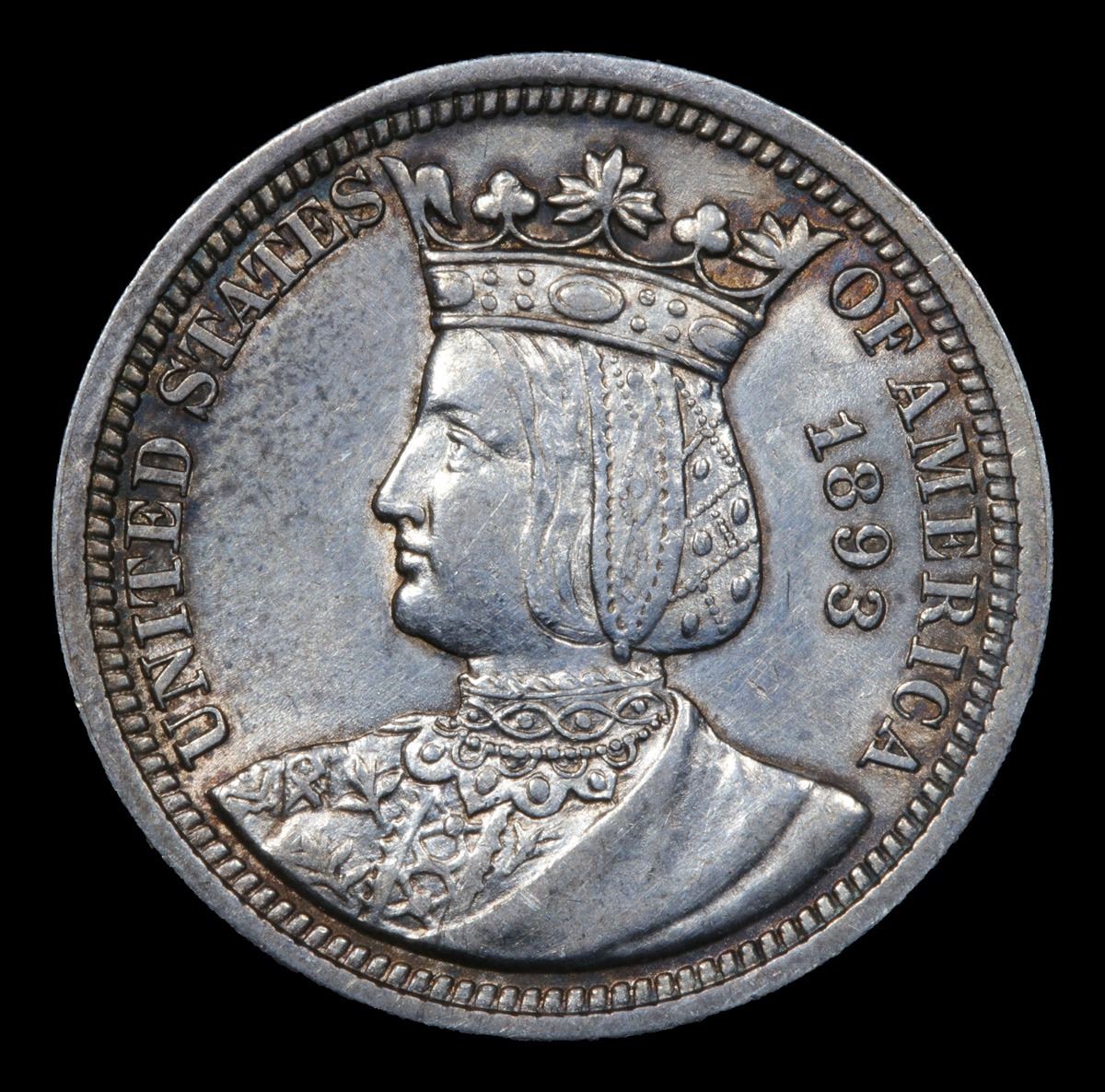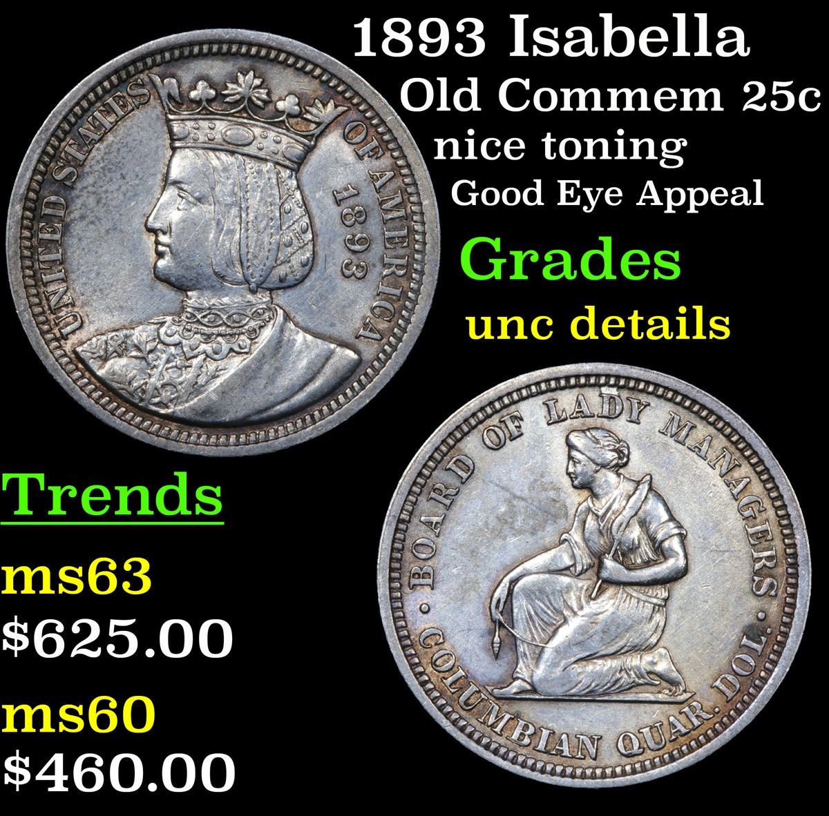 1893 Isabella Isabella Quarter 25c Grades Unc Details. When Examining an Isabella Quarter on the Obverse, wear first shows in the area of the Crown’s Central Oval Jewel and on Isabella’s cheek. Reverse wear will first be noted on the Strand of Wool Resting on the Kneeling Spinner’s Thigh. Due to Die Wear, Raised or Sharp Definition of the Strand of Wool is not the norm. This area can display a Slight Weakness of Strike, which is par for the Design and should not be Labeled Wear. Dusted with iridescent silver, this vibrant piece readily reveals bold contrast between satiny devices and watery, well mirrored fields. You won't find a finer PL example of the date. Top pop in PL, None Finer