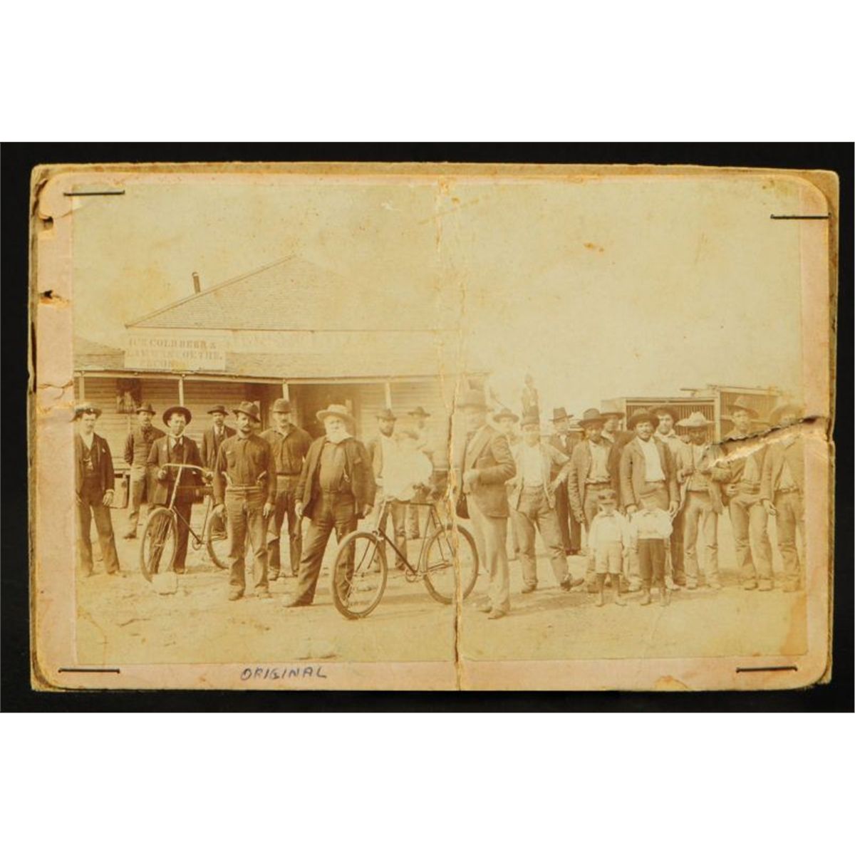 Original 1893 photograph that was later copyrighted & used to produce post cards. Photo shows the day they got their new bikes. In the background you can see the Jersey Lilly, & the Barnum & Bailey lion cage they used for a jail.