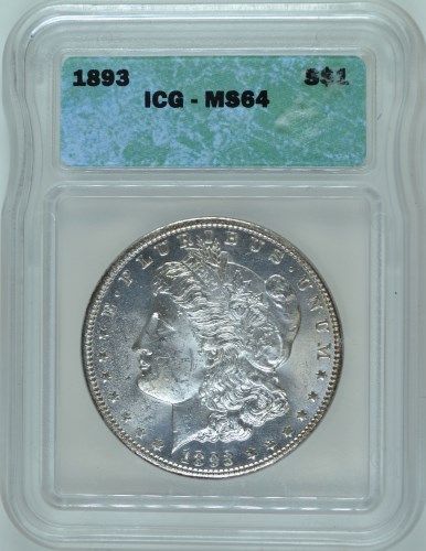 1893 MORGAN SILVER DOLLAR, ICG MS-64 BLAST WHITE, SCARCE, SUPER NICE
