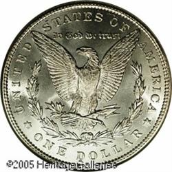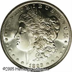 <B>1893<img border='0' src='http://www.heritagecoins.com/images/star.gif' width=10 height=10>$1 MS65 NGC.</B></I> A sparkling white coin that shows strong luster, a decent strike and excellent surfaces. One of the key dates to this series, and a very difficult coin to locate in Gem condition. Liberty's cheek has a couple of minor luster grazes, but no disturbing nicks or cuts that so often mar other coins in lower grades. As nice as this date can readily be found, with just a few known in higher grades. An excellent choice for the advanced numismatist to put away. Population: 49 in 65, 3 finer (1/05).<BR><I>Ex: Wayne Miller Morgan and Peace Dollar Collection (Superior, 1/86), lot 1303, which realized $3,740.</B></I> Lot:10406