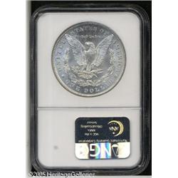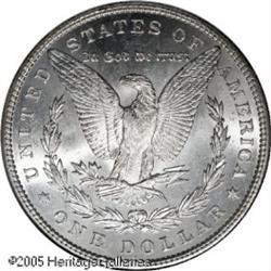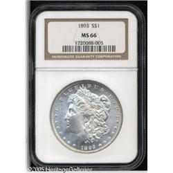 <B>1893<img border='0' src='http://www.heritagecoins.com/images/star.gif' width=10 height=10>$1 MS66 NGC.</B></I> Long regarded as one of the more difficult Morgan Dollar issues from the Philadelphia mint, only the 1894 and 1895 issues are more elusive to find in circulated grades. The limited original mintage (378,000 business strikes) of this date guarantees its continued popularity among Morgan Dollar specialists. Uncirculated examples are always available for a price, but Gems are very scarce and premium Gems such as the present coin are virtually unheard of. Indeed, between NGC and PCGS, only six pieces have been certified at this lofty grade, with none higher (1/05).<BR> A brilliant and frosty Gem with nearly immaculate fields. A couple of microscopic milling marks are located on Liberty's vulnerable cheek, these only being mentioned for future pedigree purposes. The peak of the 3 in the date is recut. As is the strike is good, this Condition Census piece will be the standout of any collection of Morgans.<BR><I>From The Banks Collection.</B></I> Lot:10407