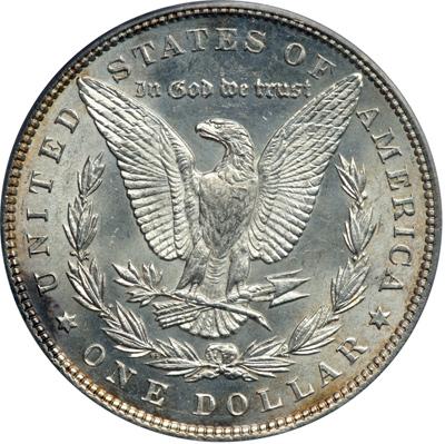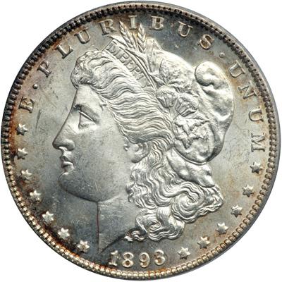 1893 Morgan Dollar. PCGS graded MS-63. A nice white coin with golden toning around the edges. Highly lustrous with the shimmering satin-like frost P-mint coinage of the 1893 is so well known for (PCGS # 7220) .