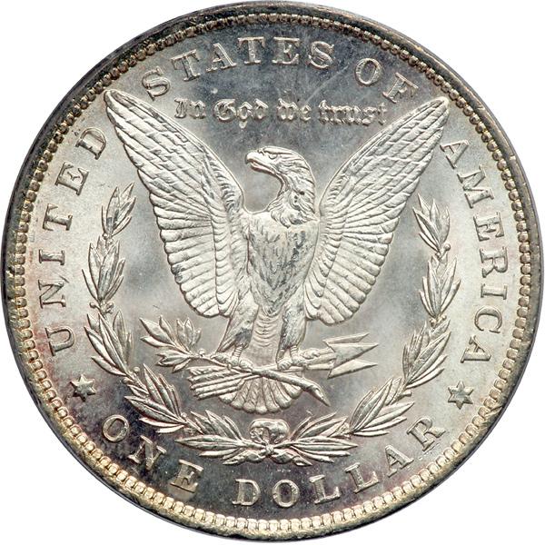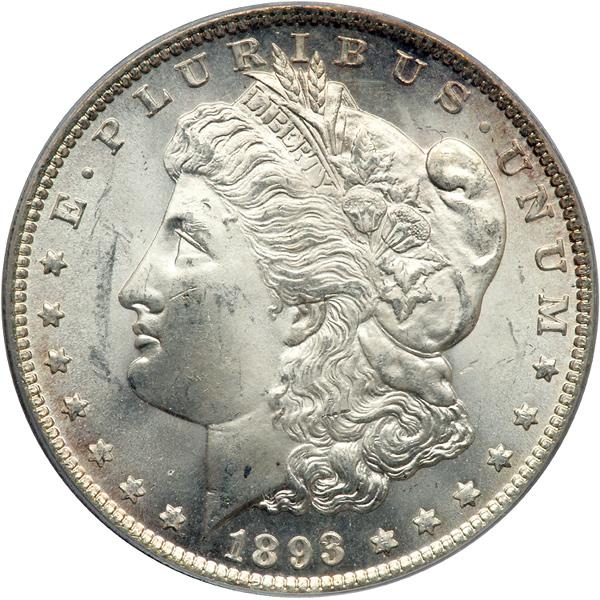 1893 Morgan Dollar. PCGS graded MS-64 PQ. A trace of toning can be seen here and there about the borders on both sides. Mostly a white coin. Boldly struck (PCGS # 7220) .
