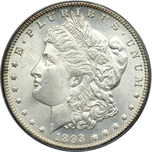 1893 Morgan Dollar. PCGS graded MS-63. Frosty and untoned. Strong metal flow augments the already showy mint luster that covers the surfaces of this low-mintage P-mint issue, giving the coin a fresh, glowing appearance. The mint luster is only unhindered by toning. On the heels of such active luster, we are pleased to describe a coin faithful to every detail from a full blow by the dies. The only slight weakness, it seems, affects the hair above the ear (PCGS # 7220) .