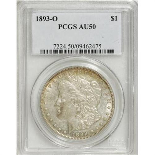<B>1893-O $1 AU50 PCGS.</B></I> Luster is evident in the protected areas of this silver-tan Morgan, with deeper amber color seen near the rims. Some of the flatness in the details can be attributed to a slightly weak strike, characteristic of this New Orleans issue, rather than actual wear.<BR><BR><B>Coin Engraver:</B> George T. Morgan<BR><BR><b>Shipping:</b> Coins & Currency (<a target="_blank" href="http://www.heritageauctions.com/common/shipping.php">view shipping information</a>)