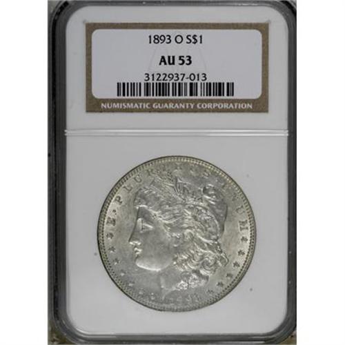 <B>1893-O $1 AU53 NGC.</B></I> Subtle silver-blue patina drapes the luminous fields of this well struck O-mint Morgan dollar. Light wear appears at the highpoints, but the remainder of the coin is comparatively unaffected.<BR><BR><B>Coin Engraver:</B> George T. Morgan<BR><BR><b>Shipping:</b> Coins & Currency (<a target="_blank" href="http://www.heritageauctions.com/common/shipping.php">view shipping information</a>)