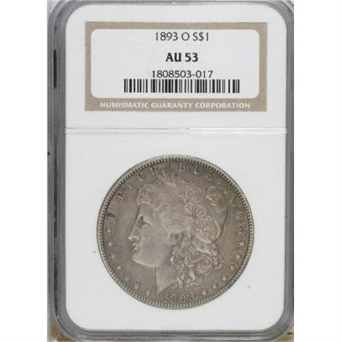 <B>1893-O $1 AU53 NGC.</B></I> NGC Census: (133/964). PCGS Population (128/1299). Mintage: 300,000. Numismedia Wsl. Price for NGC/PCGS coin in AU53: $825. (#7224)<BR><BR><B>Coin Engraver:</B> George T. Morgan<BR><BR><b>Shipping:</b> Coins & Currency (<a target="_blank" href="http://www.heritageauctions.com/common/shipping.php">view shipping information</a>)