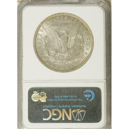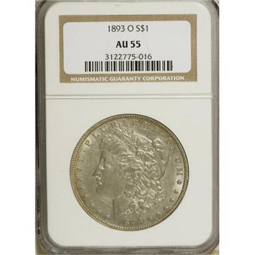 <B>1893-O $1 AU55 NGC.</B></I> Though this piece shows slight wear at the hair over Liberty's ear, the remainder of this attractive coin offers powerful luster. Well struck with elegant green-gold patina over each side.<BR><BR><B>Coin Engraver:</B> George T. Morgan<BR><BR><b>Shipping:</b> Coins & Currency (<a target="_blank" href="http://www.heritageauctions.com/common/shipping.php">view shipping information</a>)