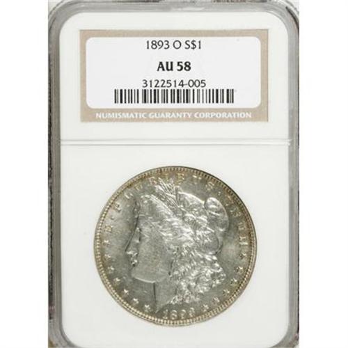 <B>1893-O $1 AU58 NGC.</B></I> All of the 1893 Morgan dollars are scarce issues, and the '93-O is no exception, with only 300,000 pieces struck. The centers of this near-Mint coin are typically softly defined, probably from improperly basined dies, and there is a considerable amount of luster remaining for the grade. Lightly worn with numerous wispy hairlines and a few noticeable marks. Attractive touches of peripheral toning are noted on both sides. <BR><BR><B>Coin Engraver:</B> George T. Morgan<BR><BR><b>Shipping:</b> Coins & Currency (<a target="_blank" href="http://www.heritageauctions.com/common/shipping.php">view shipping information</a>)