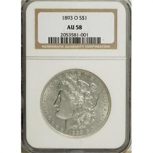 <B>1893-O $1 AU58 NGC.</B></I> A trace amount of highpoint friction and a few faint hairlines on each side keep this attractive example from a Mint State holder. Lustrous and untoned, with a small number of scattered marks. 1893 was a year of limited mintages for the Morgan dollar, not only at the New Orleans Mint but at Philadelphia, Carson City and San Francisco as well.<BR><BR><B>Coin Engraver:</B> George T. Morgan<BR><BR><b>Shipping:</b> Coins & Currency (<a target="_blank" href="http://www.heritageauctions.com/common/shipping.php">view shipping information</a>)