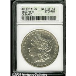 <B>1893-O<img border='0' src='http://www.heritagecoins.com/images/star.gif' width=10 height=10>$1 --Cleaned--ANACS. AU Details, Net XF45.</B></I> This untoned and lightly marked slate-gray example is minutely etched from a prior silver dip, although ample subdued luster remains. The lowest mintage O-mint Morgan Dollar.